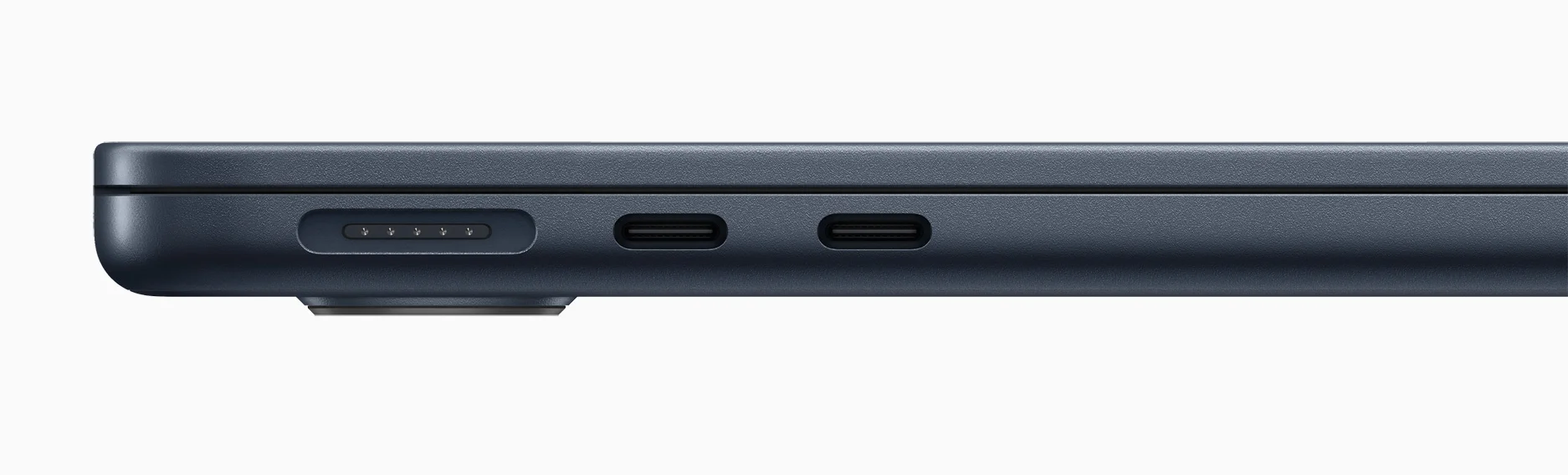 Kot že doslej ima tudi po novem Macbook Air dva priključka USB-C 4 (Thunderbolt 4) in izhod za slušalke (tudi take z visoko impedanco), toda dodali so magnetni MagSafe, namenjen izključno polnjenju. Polniti je sicer mogoče tudi čez oba ostala priključka, a tadva sta lahko ob uporabi MagSafe oba v uporabi za kaj drugega, denimo zunanje diske, prenašanje datotek s fotoaparatov, kamer ali telefonov in priklop še kakšne periferije.