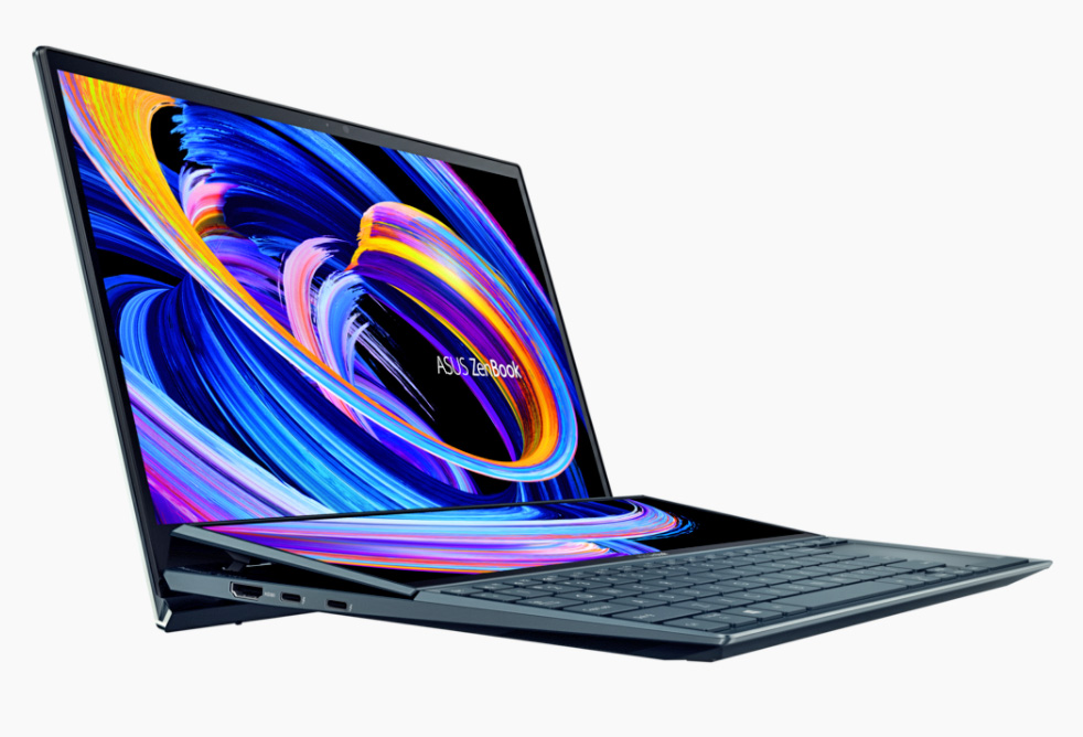Pri tej znamki je že nekaj let v ospredju vgrajevanje po dveh zaslonov v prenosnike. Začelo se je z malim enkranom namesto klasične sledilne ploščice, potem pa so prešli na dodatni zaslon (Screenpad plus) med glavnim in tipkovnico, ki je zaradi tega pomaknjena povsem proti spodnjemu robu prenosnika. Še naprej sta na voljo dva tovrstna modela, ekstra zmogljivi in prestižni Zenbook Pro Duo 15 (UX582), z zaslonom OLED (glavnim), ter manjši, manj konkretni in dostopnejši Zenbook Duo 14 (UX482). Prvi je bil deležen predvsem osvežitve pri procesorjih, drugi pa tudi rahle v sami strojni zasnovi, seveda po vzoru velikega brata.