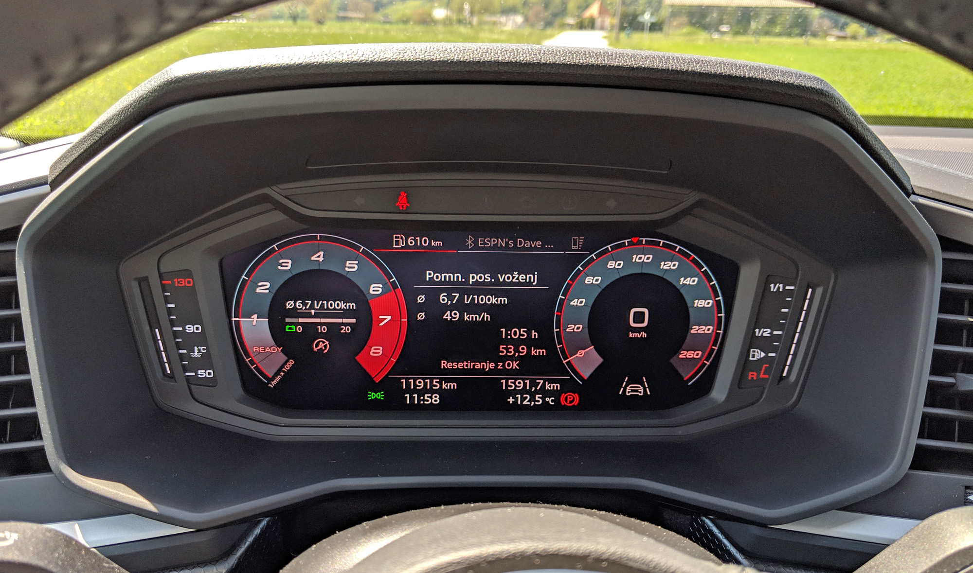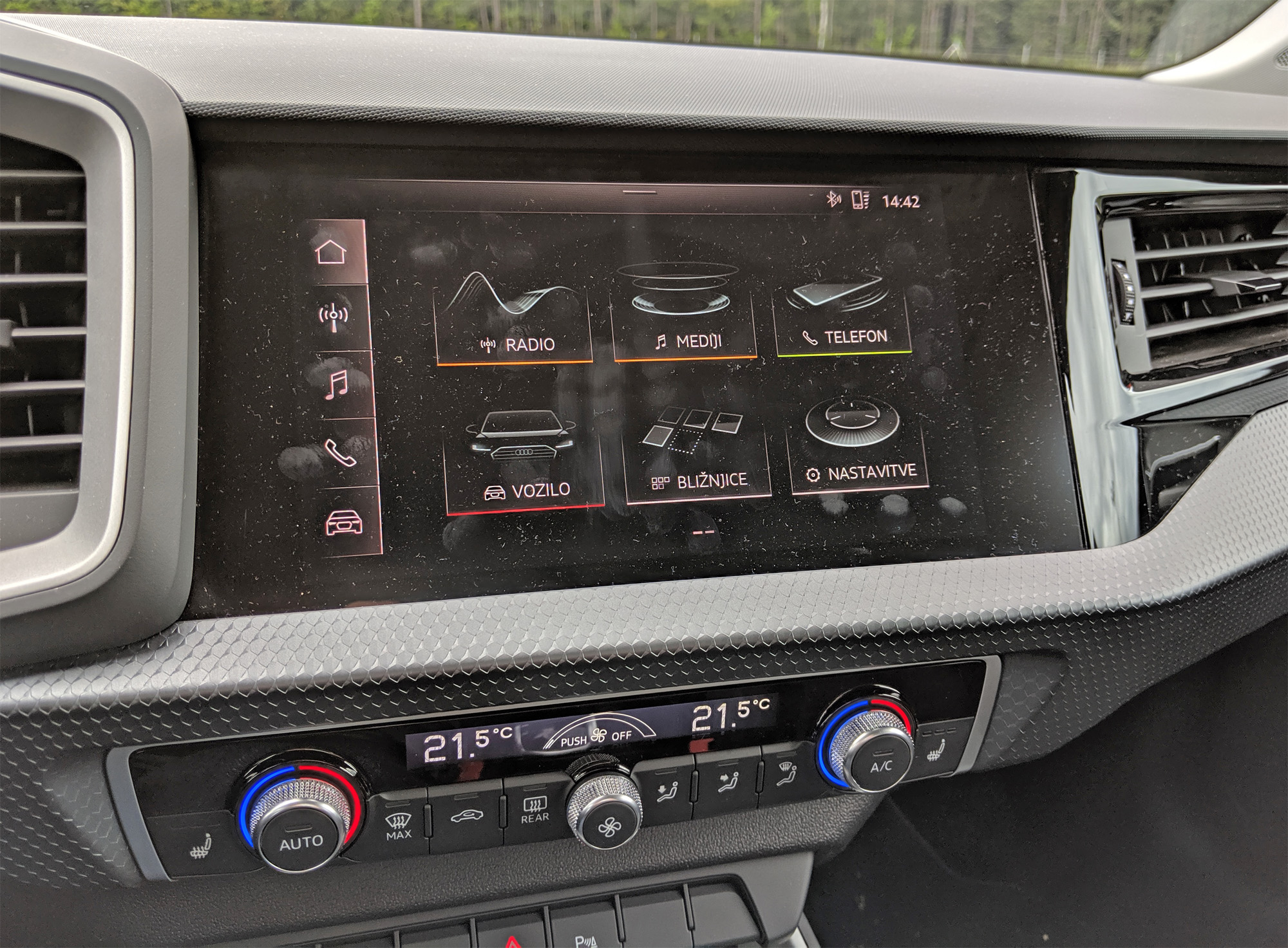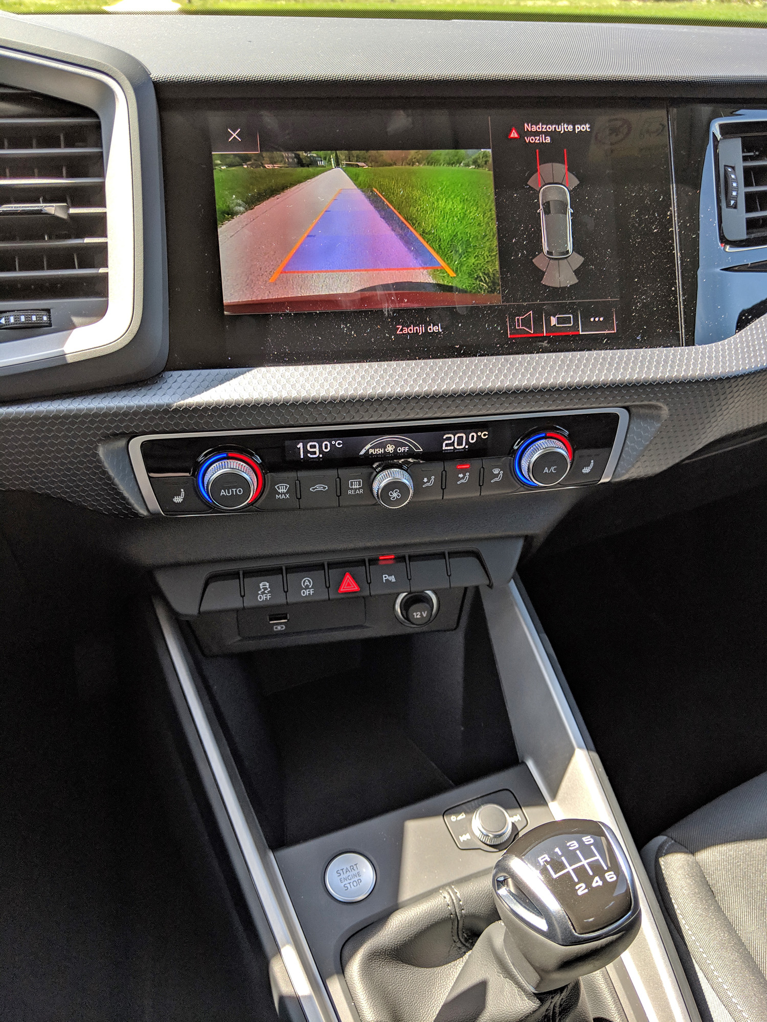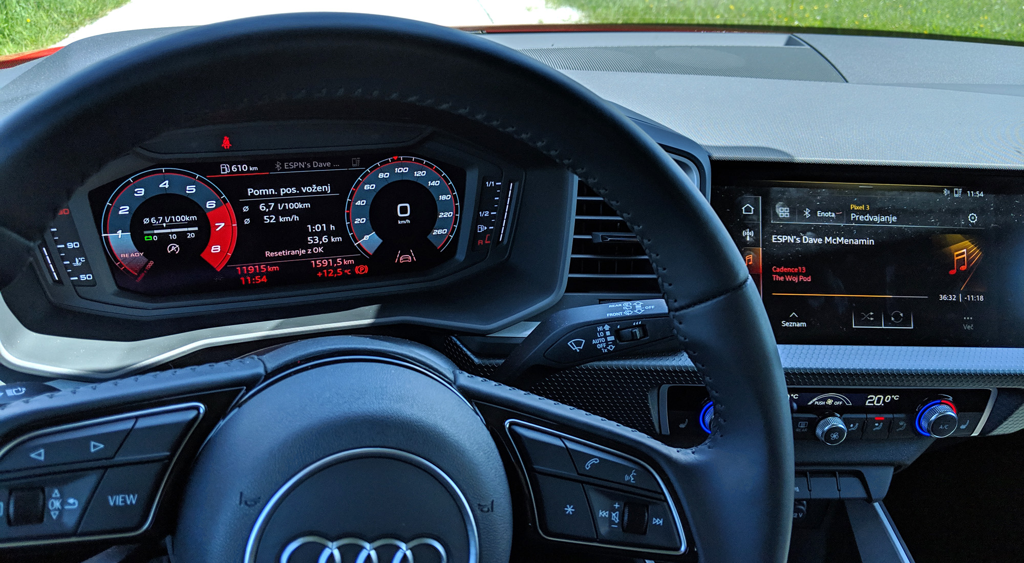 Komur bo med tako vožnjo dolgčas, se lahko kratkočasi s tem, kar prikazujeta omenjena zaslona. Tisti, ki nadomešča merilnike, je še posebej fin, ker ponuja več grafične pestrosti in informacij. Še več bi jih, če bi bila v avtu vgrajena navigacija in bi prikazoval zemljevid, vendar žal ni bila. Pri premijskih znamkah namreč ostaja salamensko drag dodatek. Zato je precej ceneje doplačati z možnost priklopa telefona prek protokola Android Auto ali Carplay, vendar testni A1 niti tega ni imel. Seveda bi bila v tem primeru navigacija omejena na osrednji zaslon. Ta je sicer velik, preprost za uporabo in sam sistem ponuja vse tisto, kar uporabnik(i) pričakujejo. Pri kameri bi se mogoče lahko dalo raztegniti sliko na celoten zaslon, a sicer je ta zelo lepa. Moti pa me dvoje – grafika je skopa in tako pušča veliko črnine, kar pomeni tudi veliko odbleskov in vidnih prstnih odtisov, zaslon pa tudi zahteva malo preveč pritiska za moj okus.