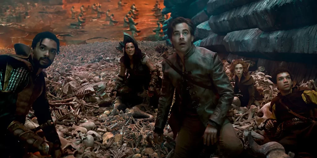 Izstopata dva »modela«. Novodobni kapitan Kirk (Chris Pine) v vlogi Edgina Darvisa, utelešenje »častne lopovske«, ter njemu kontradiktorni karizmatični prevarant Forge Fitzwilliam (Hugh Grant). Ta se v želji, da bi ukradel bajeslovno bogastvo, spajdaši s čarovnico Sofino (Daisy Head), ki je edino pravo utelešenja zla v konstelaciji nastopajočih likov. Njima se torej zoperstavi vkup zbrana ekipa, v kateri so še barbarka Helga Kilgore (Michelle Rodriguez), nesamozavestno čarovnik Simon Aumar (Justice Smith) in druidka Doric (Sophia Lillis). Ko se spoznaš s kratkimi »navodili«, kaj se je že zgodilo in pripeljalo do trenutne situacije, se zgodba suče po utečenih kolesnicah. Poiščejo neomadeževanega in (preveč) načelnega Xenka Yendarja (Regé-Jean Page), ki jim lahkega srca pokaže skrivališče bajeslovne čelade ter po (pre)dolgih dveh urah junaško ustavijo sile zla.