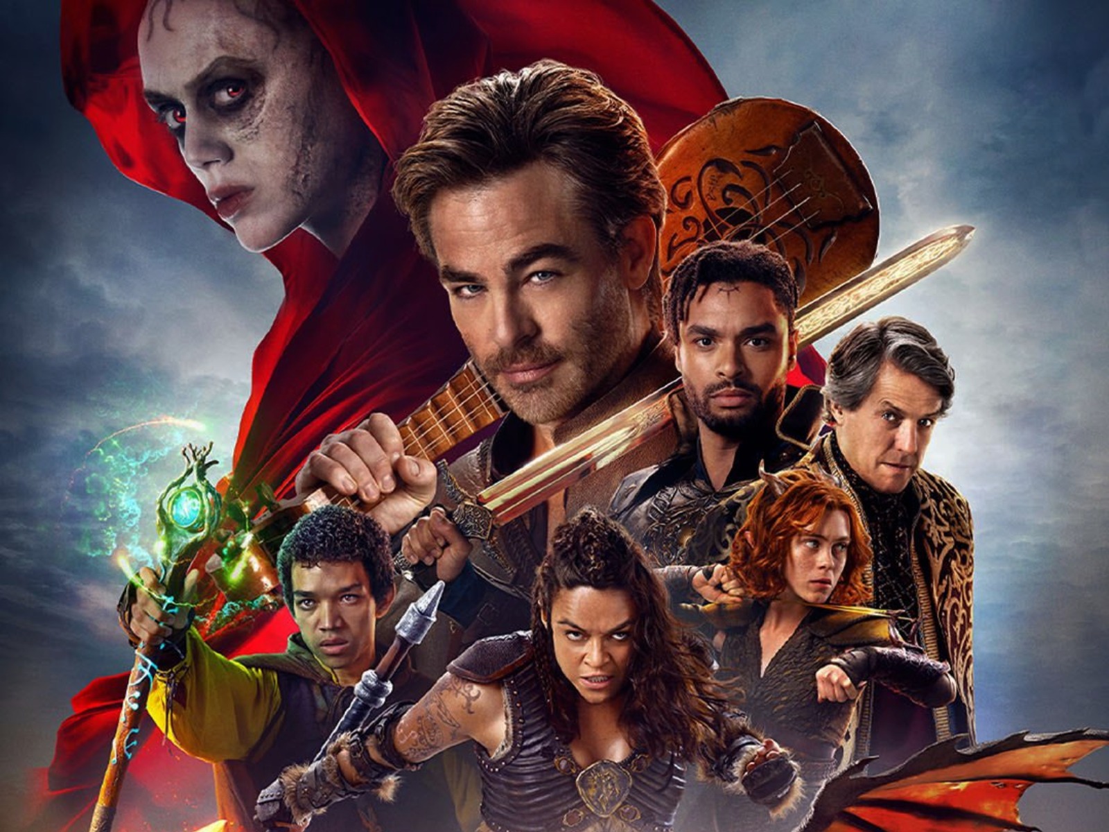 Izstopata dva »modela«. Novodobni kapitan Kirk (Chris Pine) v vlogi Edgina Darvisa, utelešenje »častne lopovske«, ter njemu kontradiktorni karizmatični prevarant Forge Fitzwilliam (Hugh Grant). Ta se v želji, da bi ukradel bajeslovno bogastvo, spajdaši s čarovnico Sofino (Daisy Head), ki je edino pravo utelešenja zla v konstelaciji nastopajočih likov. Njima se torej zoperstavi vkup zbrana ekipa, v kateri so še barbarka Helga Kilgore (Michelle Rodriguez), nesamozavestno čarovnik Simon Aumar (Justice Smith) in druidka Doric (Sophia Lillis). Ko se spoznaš s kratkimi »navodili«, kaj se je že zgodilo in pripeljalo do trenutne situacije, se zgodba suče po utečenih kolesnicah. Poiščejo neomadeževanega in (preveč) načelnega Xenka Yendarja (Regé-Jean Page), ki jim lahkega srca pokaže skrivališče bajeslovne čelade ter po (pre)dolgih dveh urah junaško ustavijo sile zla.