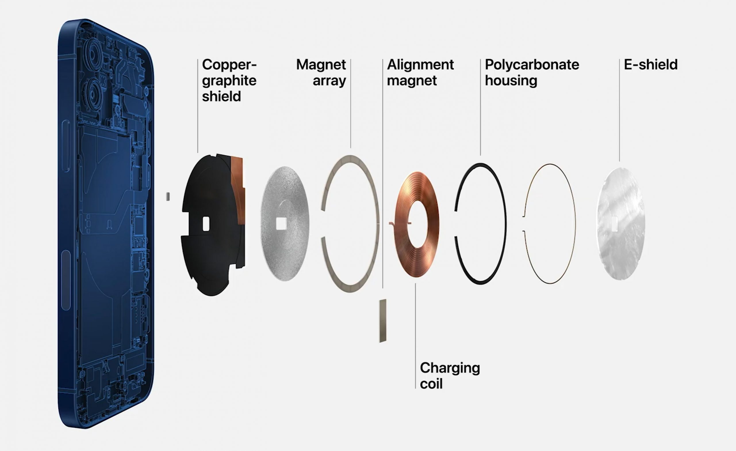 Medtem je Apple pri družini telefonov iPhone 12 ubral nekoliko drugačen pristop. To podjetje tako ali tako običajno ne tekmuje s kitajskimi pri doseganju takih ali drugačnih rekordov, temveč se osredotoča na čim boljšo uporabniško izkušnjo. Novi modeli imajo poleg tuljave za brezžično polnjenje še magnete, da stojijo na mestu, ko so na polnilnikih z oznako Magsafe, ki jo je Apple recikliral za to funkcionalnost. Magneti pa omogočajo tudi druge dodatke, denimo žepke-denarnice na ovitku.