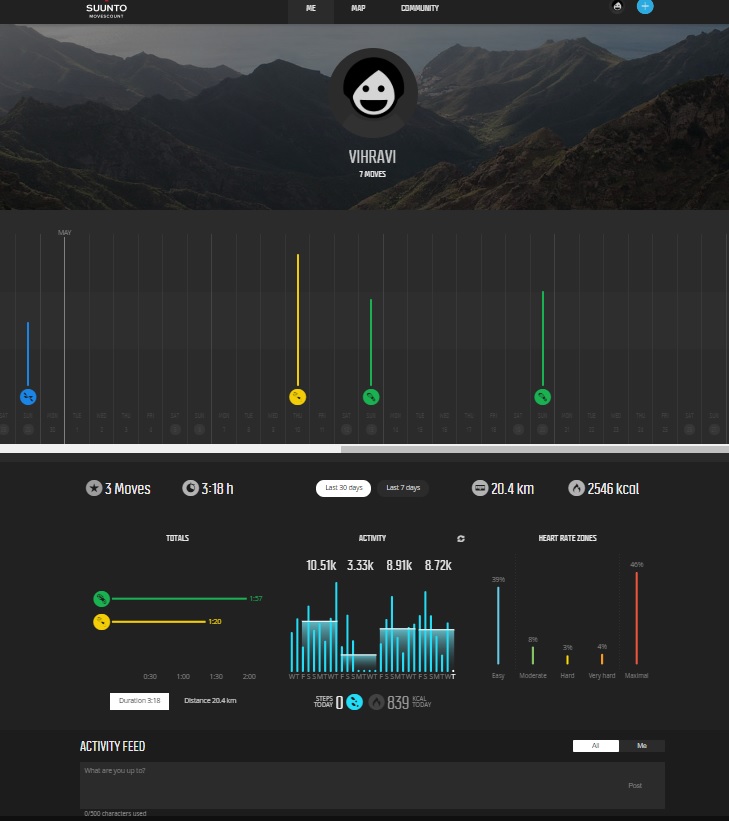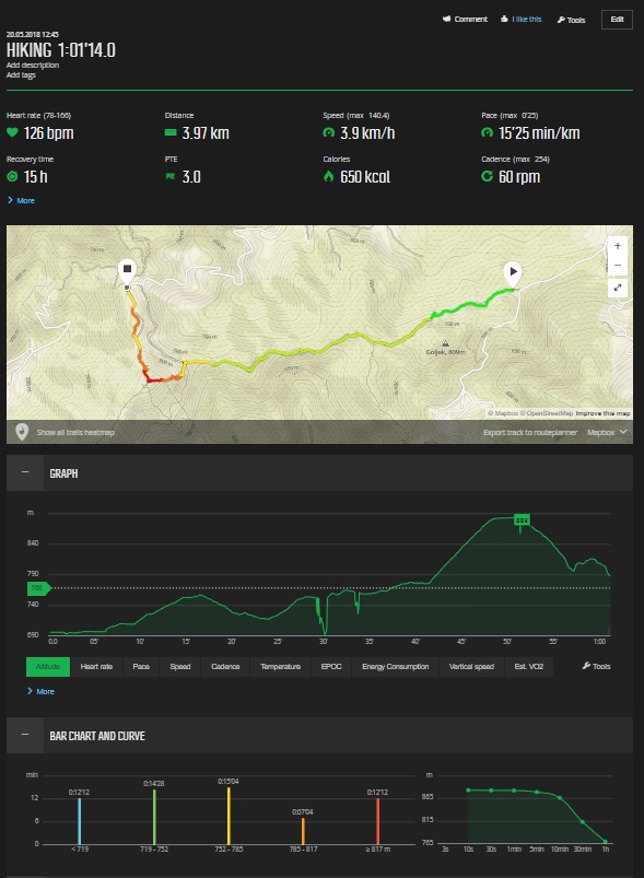 Če je ura po eni strani odličen beležnik aktivnosti z ravno dovolj pametnimi fundacijami, je po drugi strani mobilna aplikacija – obupna. Je pa treba nekaj vedeti tudi o zgodovini. Suunto je športne ure izdeloval še pred prodorom pametnih telefonov in mobilnih aplikacij. Spletna stortiev MoveScount in na splošno uporabniški vtis, ko priključiš uro na osebni računalnik, sploh ni slab. Sinhronizacija (prenos podatkov) je hitra, takisto morebitna nadgradnja firmwera. Dober, primeren, če ne rečem še česa, je tudi prikaz podatkov aktivnosti v oknu spletnega brskalnika. Predvsem pa je izredno natančen zemljevid, premagana razdalja pa je tudi obarvana glede na stopnjo »mučenja«. Zgoraj je še cel kup podatkov, med katere sodijo tudi takšne, katere moram še preučiti, dojeti (PTE in podobni). Potem je tudi še cel kup grafikonov, pravzaprav vse, kar potrebujemo za zelo natančno analizo izvedene aktivnosti ter razumevanja, kje smo slabi, kje dobri in kaj moramo izboljšati. Odkrito povedano je podatkov za povprečnega rekreativca celo preveč!