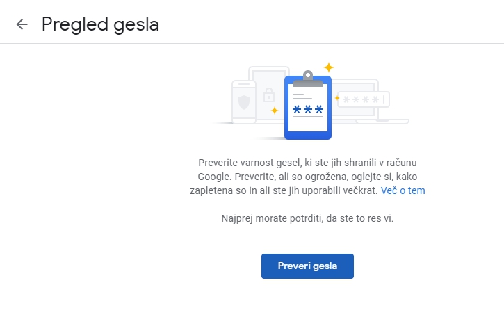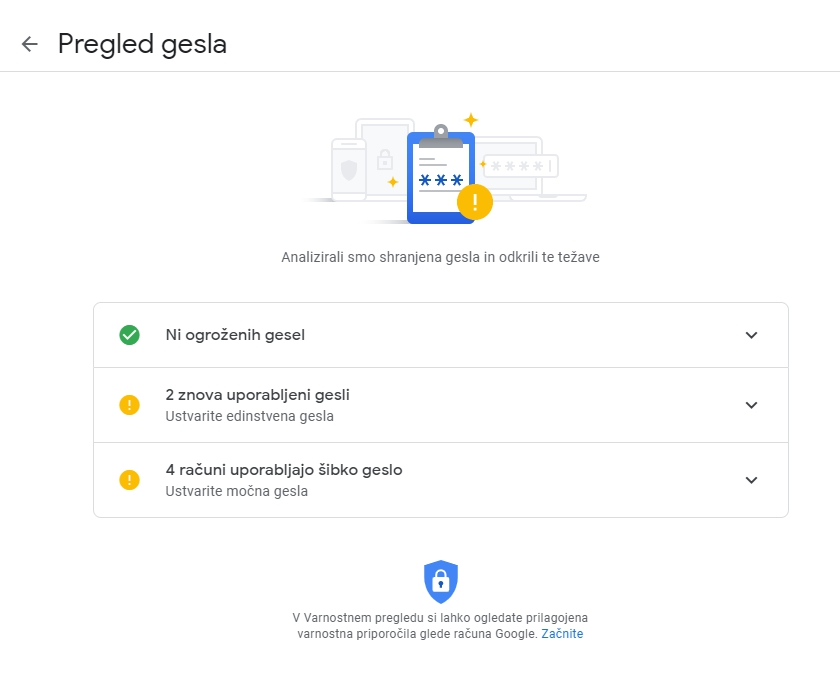 Gesla pa je pri Googlu mogoče preveriti znotraj uporabniškega računa, pod razdelkom varnost. Tam na dnu poišči bližnjico na Upravitelja gesel in ko vstopiš vanj imaš nad seznamom vseh shranjenih gesel možnost Pregled gesla. Ta po nekaj sekundah preverjanja pove, ali je bilo katero od shranjenih gesel kompromitirano, katera uporabljaš na več koncih in podobno. Vsekakor priložnost za kakšno optimizacijo. Nasvete, kako si izmišljati gesla, kako ravnati z njimi in kako se zavarovati pred vdori, pa smo dali v teh člankih: