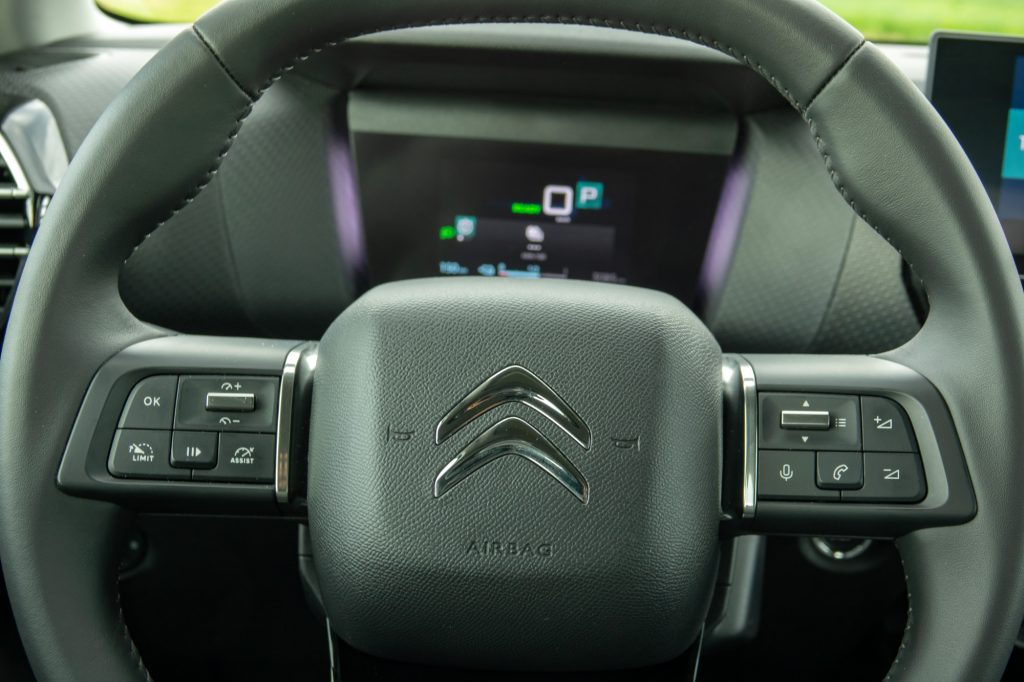 Osrednji desetpalčni zaslon si deli poreklo s tistim iz Peugeota, prav tako programska oprema, ki stoji zadaj. Grafika pa je malo drugačna in zadeva na koncu izpade manj atraktivno. Android Auto in Carplay sta prisotna, in če se vrnemo v analogno dobo, tudi Citroen za zdaj še vztraja pri fizičnih gumbih za klimatsko napravo, čeprav jo lahko uravnavamo tudi preko zaslona. Na tem lahko nastavimo še čase polnjenja, klimatiziranja, lahko pa uporabimo tudi aplikacijo za pametne telefone. Voznikov delovni prostor je dokaj standarden, z vsemi možnimi gumbi na volanu, vključno s tempomatom. Za slednjega je škoda, saj je obvolanska ročica, ki jo je Citroen tako mimogrede že imel, vsaj nam boljša rešitev. Preizkusni model je imel polprosojni zaslon, po domače HUD, pogrešali smo samodejno sledenje tarčam in gumb za izstrelitev raket, nato pa se spomnili, da smo te igre nehali igrati pred 20 leti. Osrednji voznikov zaslon je v primerjavi z drugimi prava žalost. Informacije so zelo okrnjene, brez kazalnikov trenutne moči, regeneracije in drugih malenkosti, ki nas voznike električnih vozil spravljajo v dobro voljo. Celo več, grafika je le malo boljša kot pred dvema desetletjema, pa še to na račun barvnega zaslona, največja prikazana moč motorja je 50 kW, skratka nekaj daleč najbolj dolgočasnega, kar smo videli v zadnjem času. Ob njih se zdijo analogni kazalci v VW e-up! tako rekoč napredna retro rešitev. A po drugi plati je pomembna informacija doseg oziroma kapaciteta baterije, tako da jim lahko to pogledamo skozi prste. Bolj kot zanimivo grafiko smo pogrešali radarski tempomat, saj slednji še dodatno lajša življenje voznikom električnih vozil.