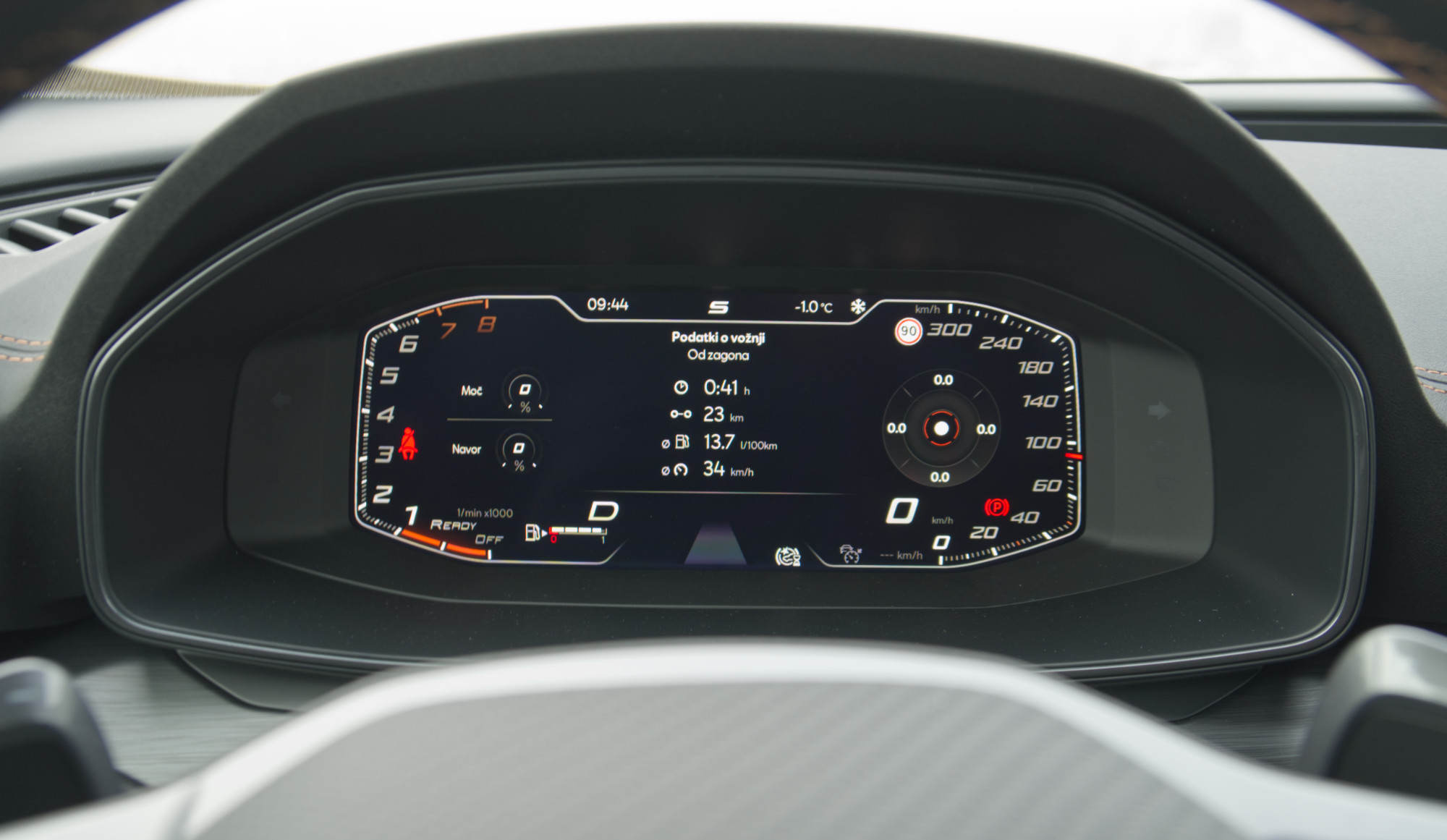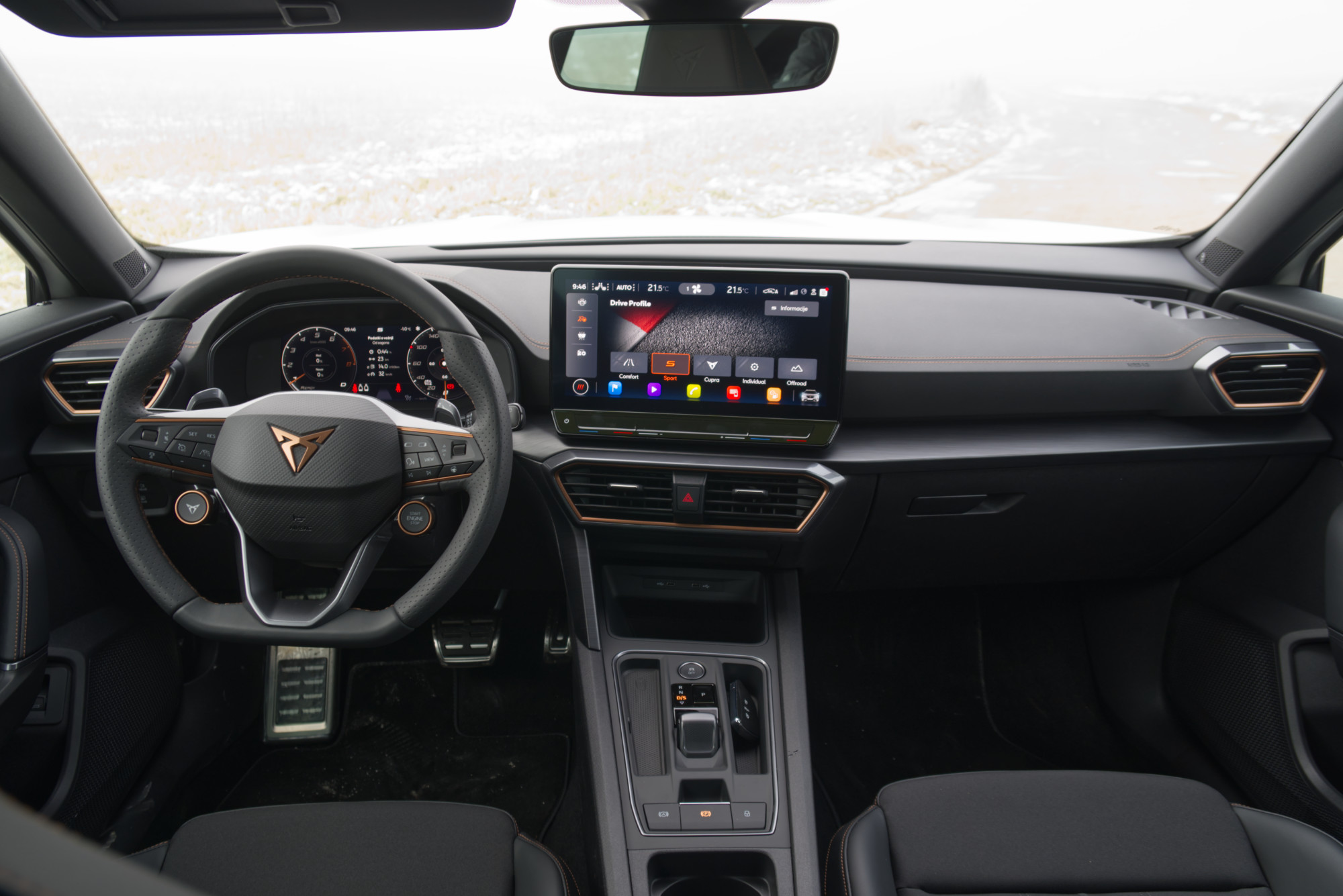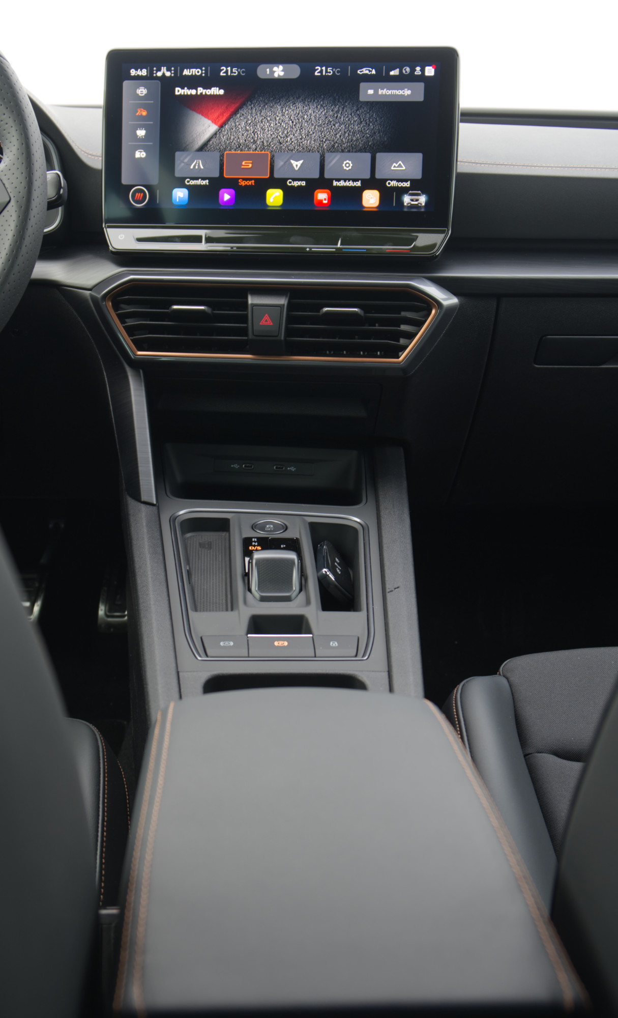 Namen tega avta je ponuditi športne občutke in dinamiko običajne kombilimuzine v bolj prostornem (in za koga udobnejšem) SUV-ju. Kolikor sem imel priložnost preizkusiti v kratki prvi vožnji, je skozi ovinke res eden najbolj uživaških »terencev«. Ponuja tudi več voznih profilov, med kateremi voznik lahko preklaplja z namensko tipko (z znakom Cupra) na volanu. Profili spremenijo odzivnost motorja, delovanje prilagodljivega tempomata, nastavitev podvozja, tudi zvok. Z »običajnim« je avto dokaj umirjen, športni profil se mi zdi po prvih vtisih najboljša izbira, saj avto ponuja prave zmogljivosti, odličen zvok in vodljivost, še vedno pa ni preveč brutalen, kot je morda v načinu Cupra. Potem je še način za terensko vožnjo, navsezadnje ima precej različic pogon na štiri kolesa in je primernih za vožnjo zunaj cest, in pa individualni profil, ki ga je mogoče prilagajati po svoje. Znova hvalim obliko volana, ki je res super, tudi tipka za zagon (na drugi strani kot tista za profile) je na zanimivem mestu. Za volanom sta lopatici za menjalnik, ki pa ju vsaj v najmočejši različici skoraj ni treba uporabljati, ker je navora vedno na pretek. Položaj voznika je izvrsten. Kot rečeno, res nisem imel občutka, da se vozim v visokem avtomobilu, kar mi je zdelo všeč.