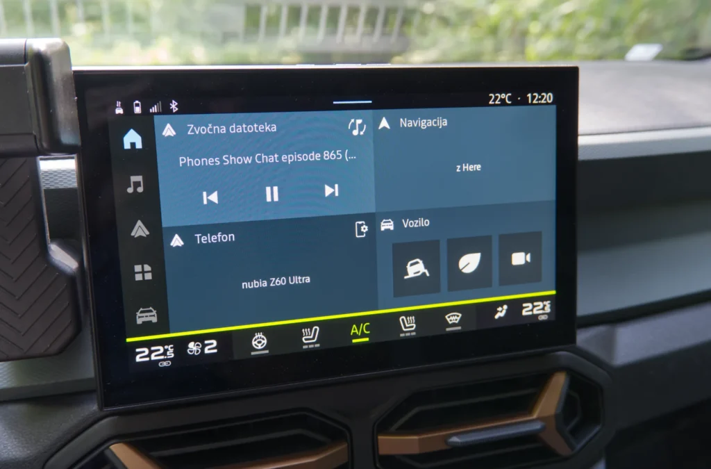 Dacia sledi trendu, da mora biti nameščena dvojica konkretno velikih zaslonov. Eden na sredi, drugi za voznika. Slednji ni zelo grafičen, a dokaj velik in prikazuje določene uporabne ter zanimive informacije, kot vedno, pa se tega ne da stisniti v en prikaz, ampak je treba preklapljati med različnimi. Sredinski infozabavni sistem sicer deluje zadovoljivo in je pregleden (tudi zato, ker ima dokaj malo funkcionalnosti), a vseeno je daleč najbolje, če preklopite na Android Auto ali Carplay.