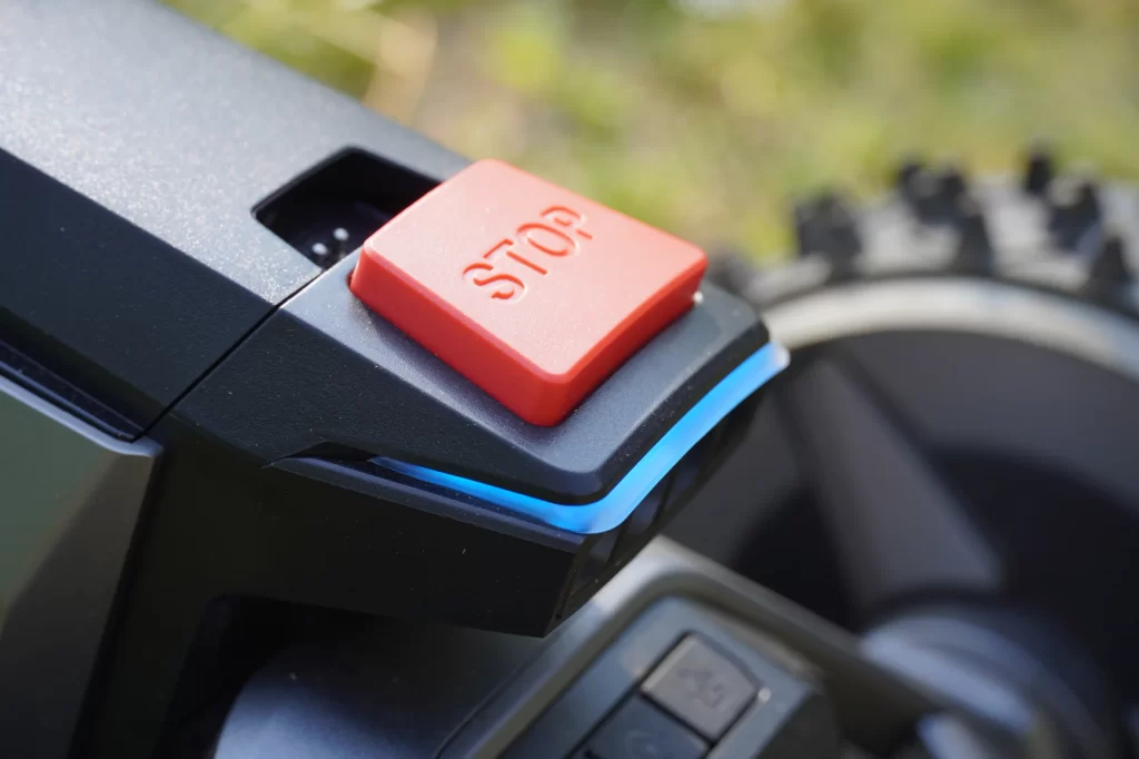 Drugo pomembno razliko v primerjavi s klasičnimi robotskimi kosilnicami že na samem robotu izdajata sprednji in zadnji del. Spredaj so namreč tri tipala, med njimi lidar, namenjena zaznavanju ovir, lukenj in podobnega, nekako v slogu robotskega sesalnika. Zadaj pa je sprejemnik za signal iz satelitskega stolpa, in lučka, ki pove, ali je signal dober (modra), ali slab (oranžna).