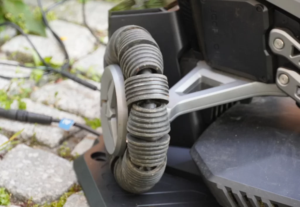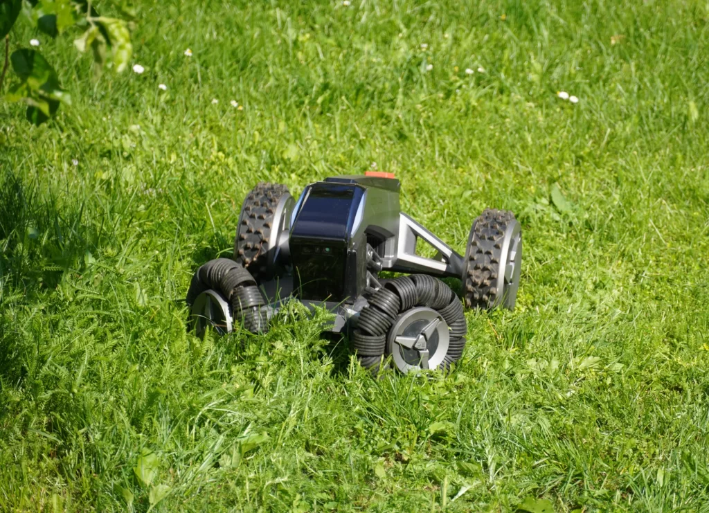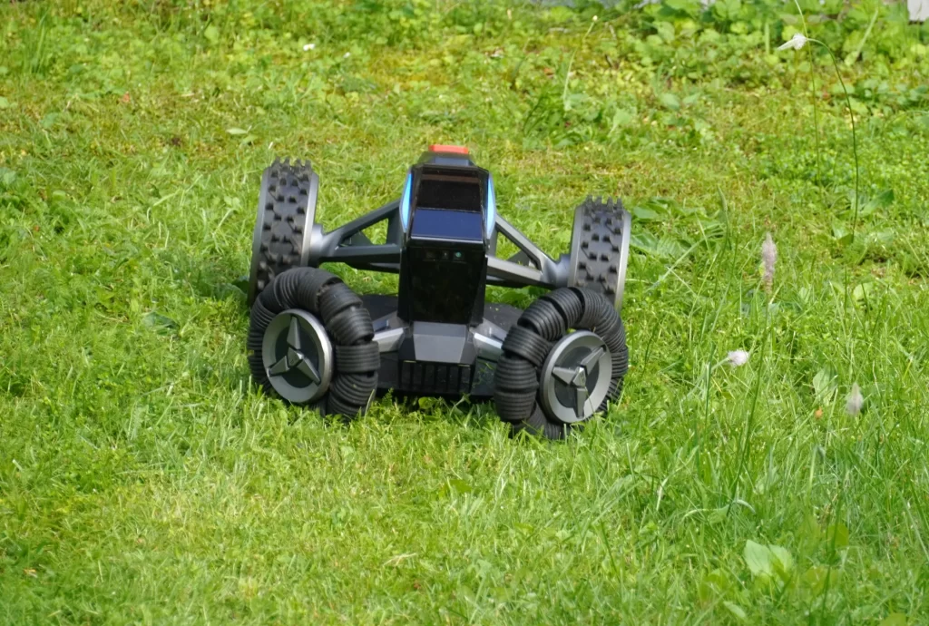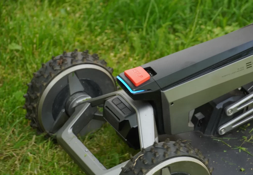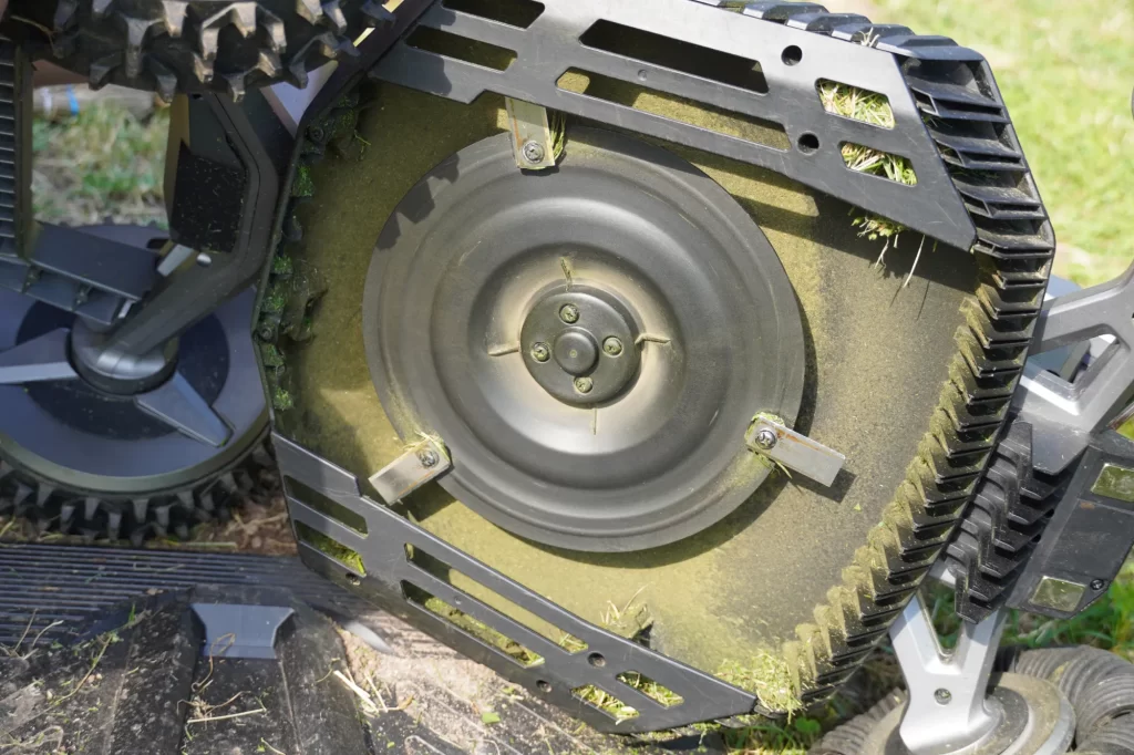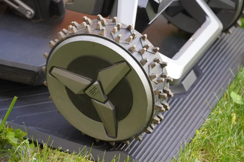Že njegova zunanjost je bistveno drugačna od klasičnih robotskih kosilnic, ki me spominjajo na vozeče se pokrove. Ta je mini terensko vozilo, povedal sem že, kakšno asociacijo sem dobil. Najbolj izstopajo kolesa, ki so zadaj robustna, trda, z nekakšnimi žebljički, spredaj pa fiksno obrnjena za približno 45 stopinj navznoter in s posamično vrtljivimi razdelki. Slednja bolj drsijo po tleh kot da bi se zares vozila, pomagajo pa pri tem, da se lahko robot praktično na mestu obrne v nasprotno smer. Poleg obes za kolesa je dobro vidno še vpetje rezila in njegovega plastičnega pokrova. Samo rezilo je podobno kot drugod, okrogla plošča s tremi premikajočimi se klinami (nekaj rezervnih je priloženih, vsaj za eno sezono bi to verjetno moralo zadostovati). Oddaljenost rezila od tal je mogoče v aplikaciji nastavljati od 20 do 76 mm. Našpičena, trda zadnja kolesa lahko, če se mora robot izkopati iz kakšne krtine ali obračati na področju z več zemlje, precej razkopljejo, zato je najbolje taka področja uvrstiti med tista, kjer naj ne kosi.