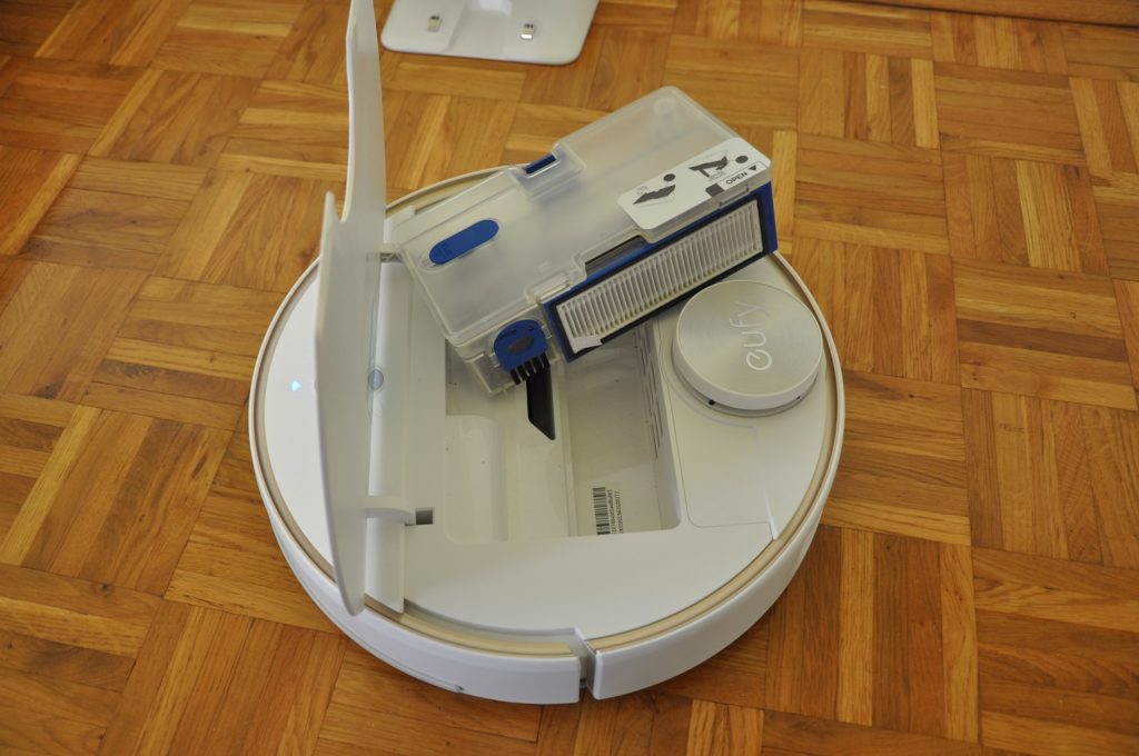 Na zunaj je sicer Eufy RoboVac L70 podoben prvi generaciji sesalnikov Roborocka (na voljo je bil sicer pod Xiaomijevim imenom). Zgoraj spredaj sta dva, namesto treh gumbov, lasersko tipalo pa je na zadnjem delu in ne v sredini, kot pri S50. Na spodnji strani pa so razlike minimalne. Krtača je modre barve namesto oranžne, drugačna pa je tudi tekalna površina obeh gonilnih koles. Nič od tega pa ne vpliva na učinkovitost sesanja, kar je edina pomembna lastnost pri tovrstnih izdelkih. Tudi L70 je kombinirana naprava, pomeni, da ima tudi nastavek s krpo, da lahko tla tudi briše. Medtem ko ima S50 posodo za vodo v nastavku, je pri L70 premaknjena v koš za smeti. Ta pa je tudi večji in ima po mojem mnenju lažje odstranljiv filter, ki bo zaradi tega morebiti tudi cenejši. Ker je posodica z majhno prostornino za vodo v košu, po eni strani poenostavi uporabo, po drugi pa dodatno zaplete konstrukcijo naprave, saj mara biti povezana z odstranljivim dodatkom za brisanje tal. Bolj, kot je nekaj zapleteno, prej se lahko pokvari. Osebno mi je zato bolj všeč posoda v dodatku, kot jo ima S50!