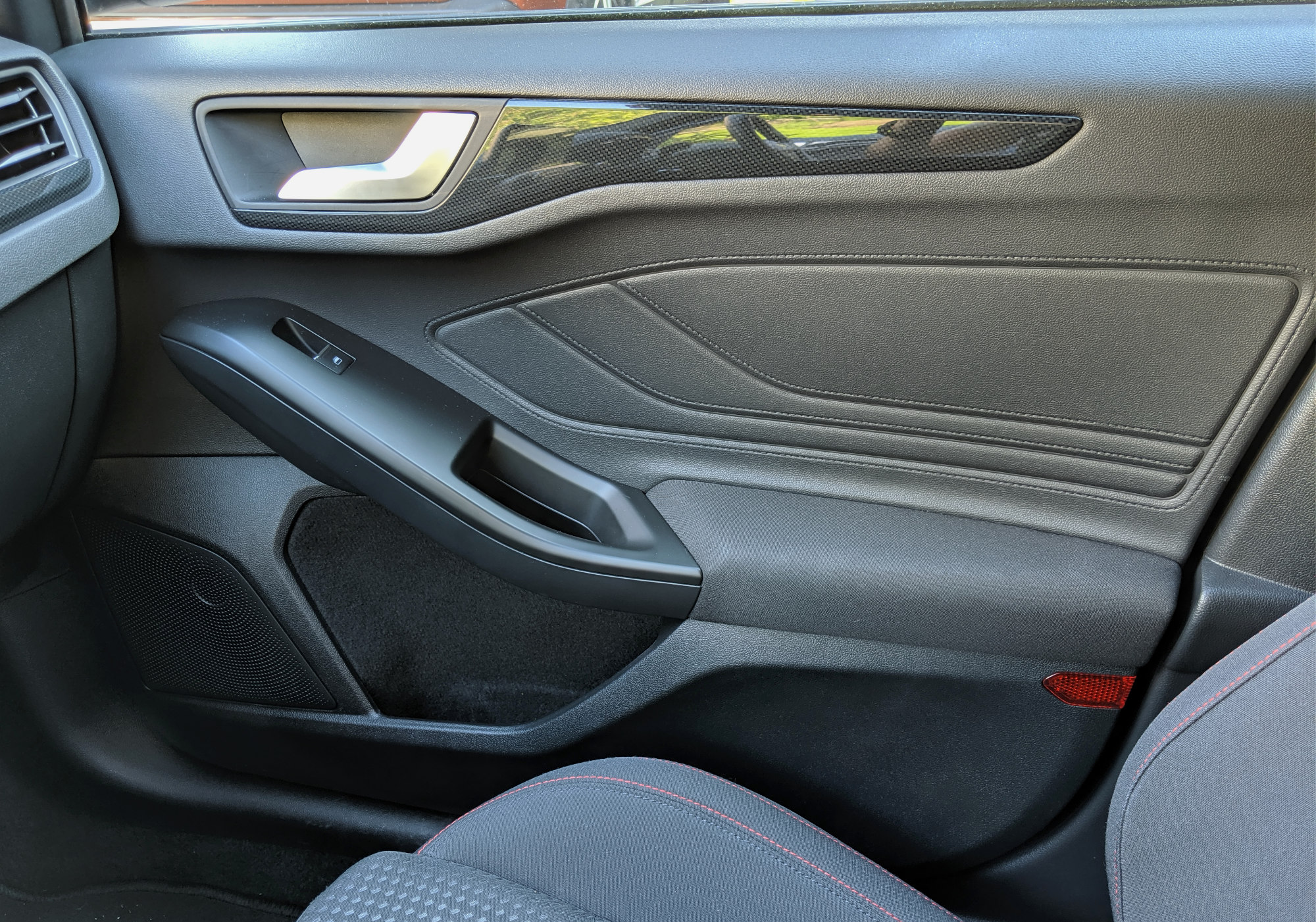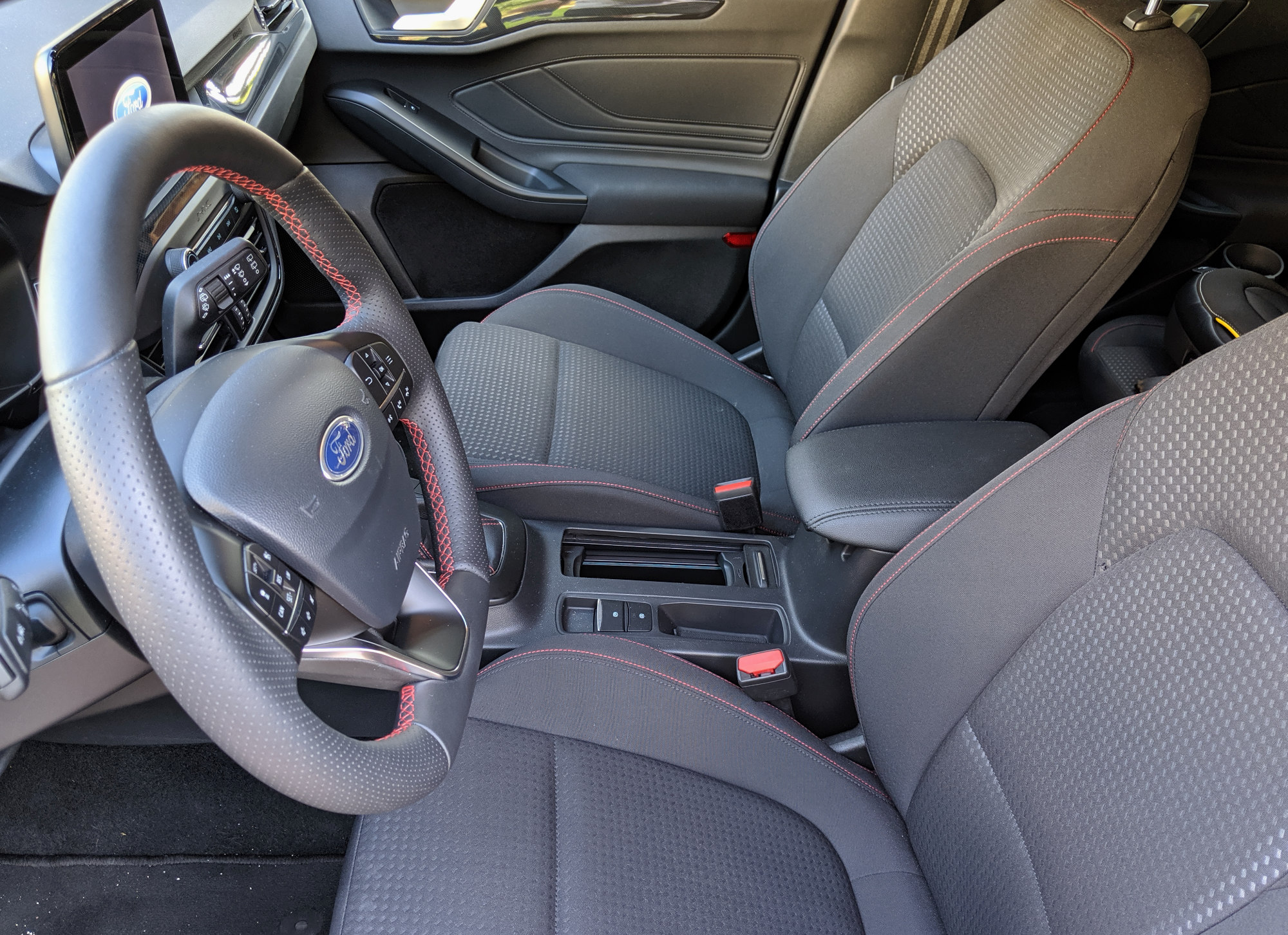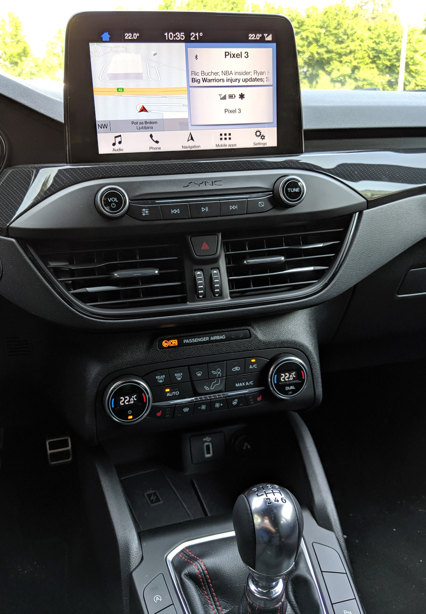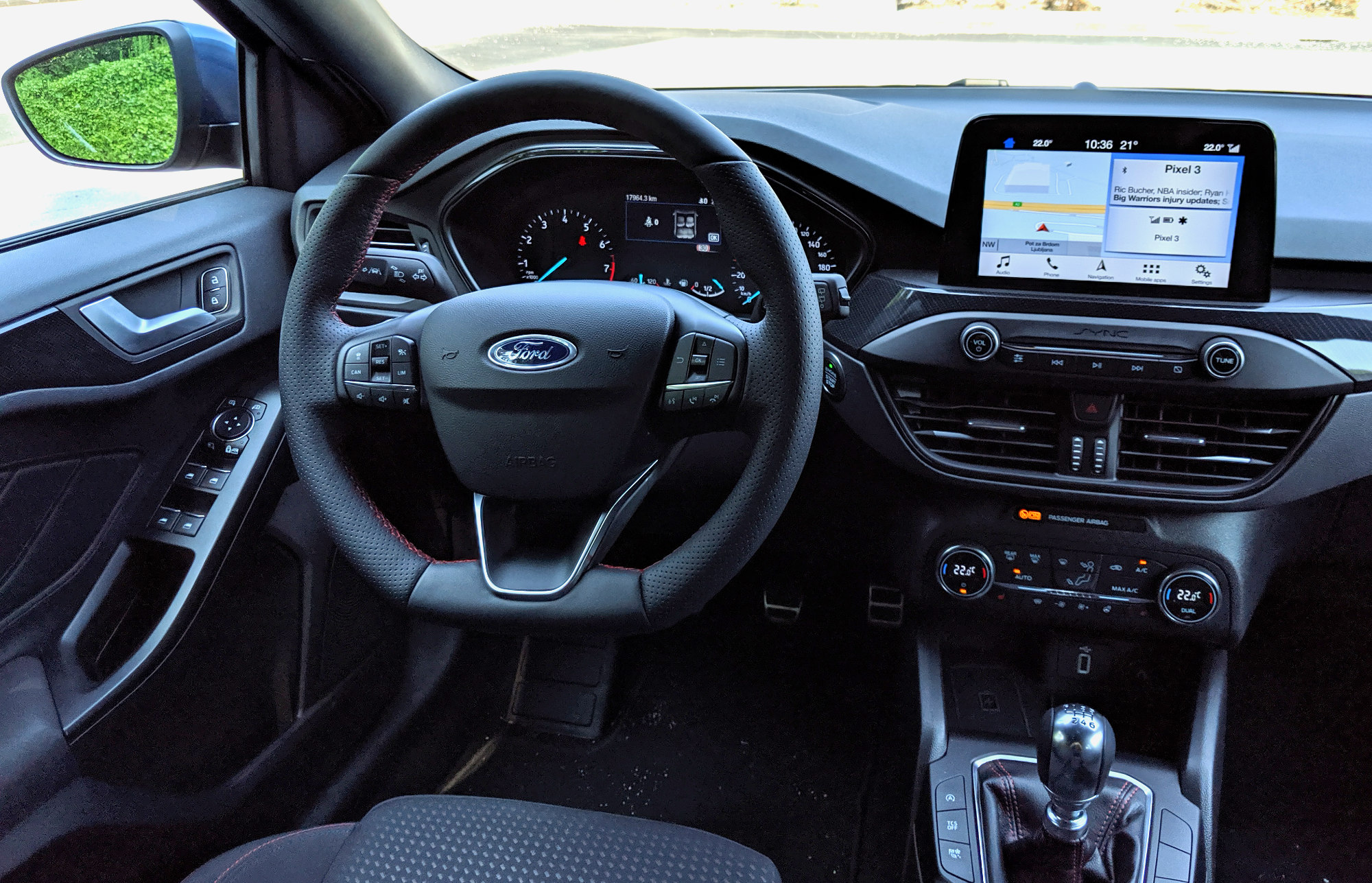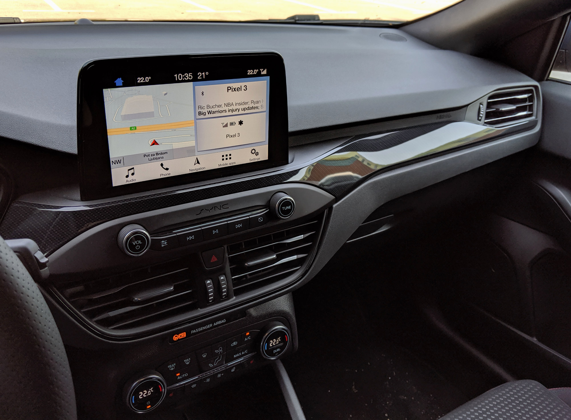 Nekoč s(m)o se pri Focusu pritoževali na številom tipk, ki jih je zdaj konkretno manj, a sem vesel, da jih je nekaj ostalo. V bistvu bi si želel še kakšne. Panel za nastavljanje gretja ali hlajenja je povsem ločen od osrednjega zaslona in izveden s klasičnimi tipkami za čisto vse funkcionalnosti (pogosto pri kakšnem avtu manjka tista za določanje, da naj temperatura velja za obe »področji«). Nekaj tipk (za upravljanje glasbe in vstop v nastavitve) je še pod zaslonom, toda sam bi jih zamenjal za druge – za hiter dostop do različnih delov infozabavnega sistema namesto za predvajanje/pavzo, naprej in nazaj. Pri infozabavi ni presenečenj. Ford ima trenutno sistem Sync 3, ki ga vgrajuje vsepovsod in razen dveh velikosti zaslon, testni avto je imel večjo, 8-palčno diagonalo, je vedno enak. Določene njegove lastnosti so mi zelo všeč, v določenih bi se ga dalo izboljšati. Po eni strani je enostaven, pregleden, ima navigacijo z »vsevedim iskanjem« (ni treba po klasičnih korakih država – mesto – ulica – itd) in vsebuje vse, kar človek pričakuje, vključno s podporo za Android Auto in Carplay, pa tudi za aplikacije iz lastne platforme. Slednje v praksi pomeni, da bi se morale prikazati podprte aplikacije, nameščene na telefonu. No, na mojem telefonu med približno 150-imi ni bilo nobene take. Po drugi strani bi bila lahko grafična podoba sodobnejša, skakanje iz enega »menija« v drugega priročnejše in integracija s telefonom lahko še boljša.