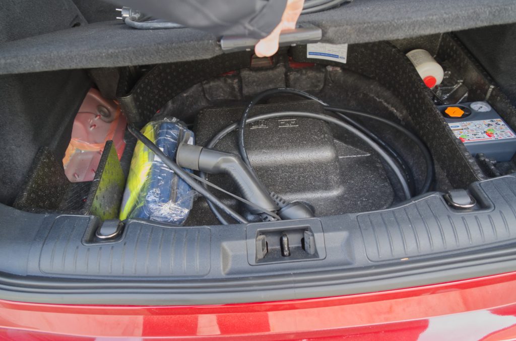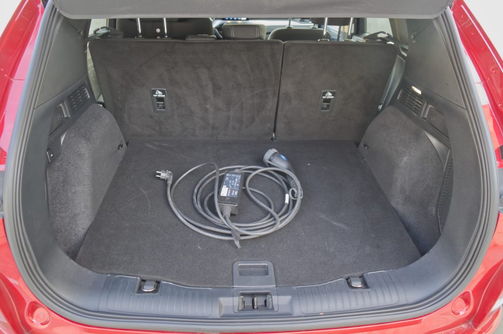 Zadaj bo težko kdo pogrešal prostor za noge, ker se ga zdi dovolj, po širini pa je najbrž to bolj avto za dva potnika na klopi kot za tri, razen če so otroci, in niso vsi v dodatnih sedežih oz. na »jahačih«. V prtljažniku pa je manj prostornine kot pri Kugi brez baterij, razlike je za približno 40 l, kar na koncu znese za ta razred (pod)povprečnih 464 l. Vsaj prostor za kable in drugo manjšo kramo je pod dvojnim dnom, skozi malo luknjo v naslonjalu klopi se da potisniti (ene) smuči ali kaj drugega daljšega in prtljažna vrata se lahko odpirajo na ukaz brce pod avtomobilom, a ne reagirajo vedno.