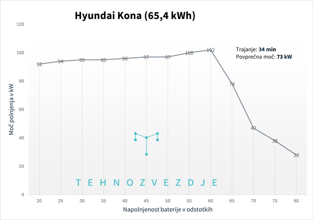 Polnjenje z izmeničnim tokom gre do standardnih 11 kW, pri čemer se z našo domačo polnilnico Kona ni ujela najbolje (na enem od režimov polnilnice je moč polnjenja konstantno skakala, česar pri avtomobilih kakšnih drugih znamk še nisem opazil), z enosmernim tokom pa uradno do 105 kW in je v prvem delu solidno hitro, v drugem pa dokaj počasno. Na našem testu je namreč trajalo 34 min, da se je baterija napolnila od 20 do 80 odstotkov. Pri tem krivulja sicer izgleda razmeroma dobra, pretežno ravna oz. celo vzpenjajoča je vse tja do 60 odstotkov, toda moči niso kdo ve kako visoke. Začelo se je malo nad 90 kW in potem zraslo vse do 102 kW, torej skoraj do obljubljene najvišje moči, nakar je najprej upadlo pod 80 kW, nato pa skoraj takoj pod 50 kW in celo pod 30 kW. Prav za teh zadnjih 20 odstotkov napolnjenosti pravzaprav traja enako dolgo (17 min) kot za prvih 40 odstotkov. V kolikor bi priklopili pri približno 10 odstotkih napolnjenosti, bi verjetno za polovično polnjenje (do 60 odstotkov) porabili 20 min, kar je dokaj sprejemljivo trajanje in to bi bila verjetno najboljša taktika, če si polnilnice ob poti sledijo dovolj pogosto. V nasprotnem primeru je treba čakati precej dlje časa, da odstotki zrastejo do 80 ali več. Za razliko od Kie EV3, ki se proti koncu polni nekoliko hitreje (prej pa z zelo podobnimi močmi), tu ni nisem opazil možnosti, da bi ročno sprožil segrevanja baterije, to je treba storiti na klasičen način z vnosom ustrezne destinacije (hitre polnilnice) v navigacijo. Slednja je nekako srednje uporabna. Dobro sicer vodi in po določenem času začne kazati predviden odstotek baterije na cilju, vendar ji manjkajo mnoge točke, ki jih druge navigacije poznajo, za izračun odstotka na cilju je treba klikniti nanj in predvidevanje ni najbolj natančno, in težko bi rekel, da je na voljo pravi načrtovalnik poti s postanki za polnjenje. Iz vsega opisanega izhaja, da Kona še vedno ostaja bolj primerna kot avto, ki ga boste večinoma polnili doma, po poti pa le občasno, medtem ko tisti, ki pogosto opravljate daljše vožnje, izbirajte med avtomobili, ki v posamezni etapi zmorejo daljšo razdaljo in se nato tudi napolnijo hitreje. V Hyundaijevi paleti sta taka denimo Ioniq 5 in 6.