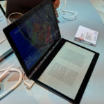 Vse našteto predpostavlja funkcionalen računalnik za vsakdanja opravila, toda glavni draž, lahko pa tudi cokla, je v spodnjem zaslonu. Tam, kjer bi morala biti tipkovnica, je velik ekran s tehnologijo e-črnila. Ta lahko služi v treh funkcijah – kot tipkovnica, površina za pisanje ali risanje, in kot e-bralnik. Tipkovnico so tokrat precej dodelali, še vedno pa bo pretežno uporabna za priložnostno tipkanje. Komur so daljša besedila kruh, si z njo ne bo mogel kaj dosti pomagati. Dodali so jih sicer zvoke in vibriranje (oboje nastavljivo v treh stopnjah ali odklopljivo) in povratni občutek je v redu, toda uporabnik ne čuti, kje so robovi tipk, zato mora biti zelo pozoren, kam bo udaril s prsti. Med tipkanjem je spodaj preslednica in pod njo krogec, ko se uporabnik dotakne tega, se namesto preslednice izriše sledilna ploščica. S pisalom se na sejmu nismo uspeli veliko ukvarjati, prikaz besedil na tem zaslonu pa je fin za branje daljših besedil ali celo knjig. Naprava je tudi dovolj lahka, da je ne bi smelo biti problem dlje časa držati. In ker je yoga, se seveda obrne naokrog v »tablico«. Daleč največja ovira za prodor tega izdelka v množičnost pa bo cena. Izhodiščna bo namreč en evro pod tisočakom, zmogljivejši procesor bo verjetno pridodal še stotaka, enako velja za 256 namesto 128 GB SSD-ja.