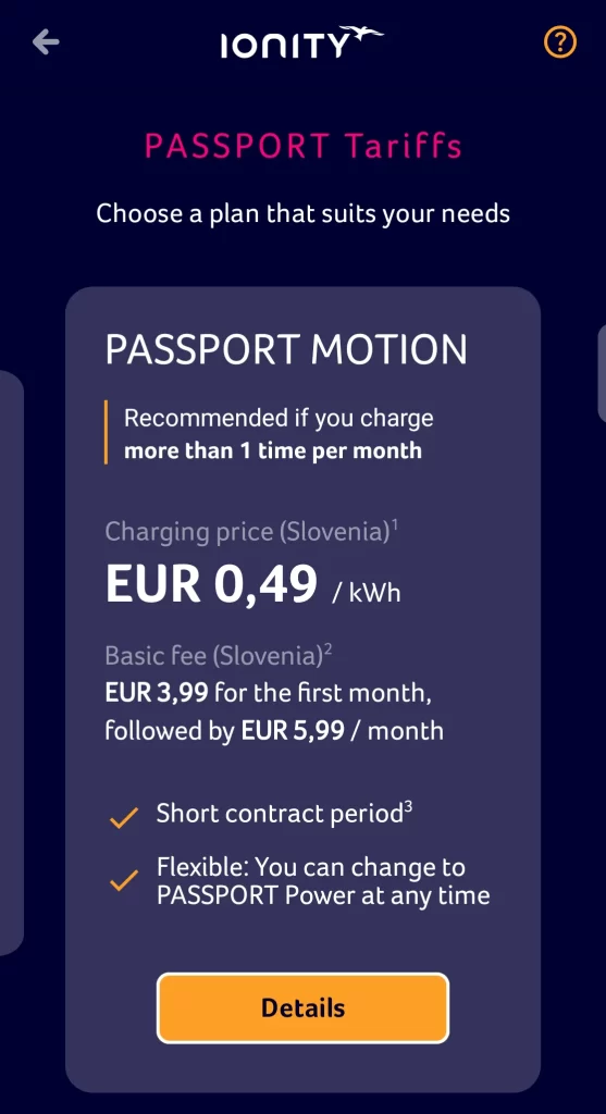 Ta ponudnik je od lani jeseni ponujal naročnino Passport za 5,99 evrov (pred tem za 11,99 evrov), ki je naročnikom ob polnjenju prek aplikacije znižala ceno na kWh za 20 centov. Tako se je splačala po pretočenih 30 kWh, torej že po enem polnjenju od denimo 20 do 80 odstotkov na mesec. Ta naročnina ostaja, a se ji po novem reče Passport Motion. Dodali pa so še naročnino Passport Power za prejšnjih 11,99 evrov, ki zniža ceno na kWh za 30 c, in se tako splača po 40 kWh. Od takrat naprej je prihranek še večji. Tudi to se lahko doseže že v enem samem polnjenju, saj smo denimo na naših testiranjih hitrosti polnjenja od 20 do 80 odstotkov, ki se kdaj začne tudi pri nižji napolnjenosti baterije (najmanj je bilo 10 odstotkov) večinoma pretočili nekje od 35 do 55 kWh, največ je bilo 57 kWh, pri čemer sploh nismo polnili kakega avta z zares veliko kapaciteto baterije (npr. čez 90 kWh).