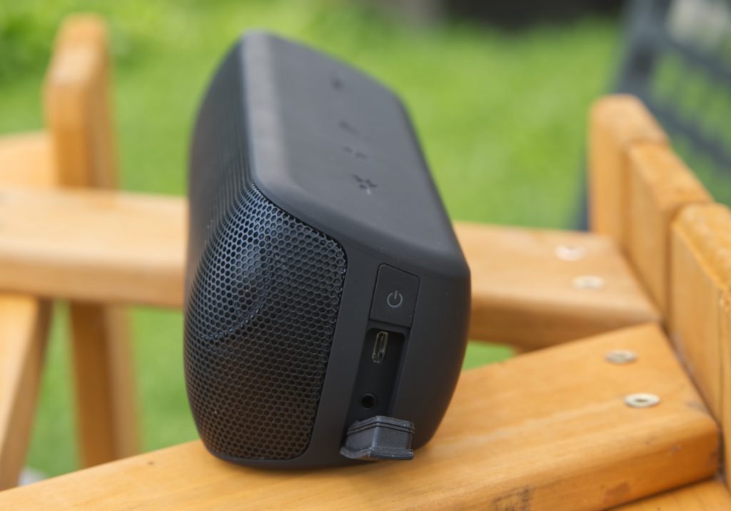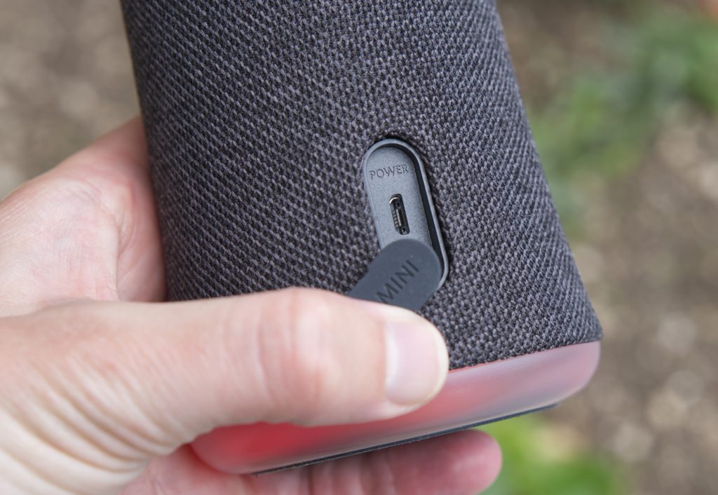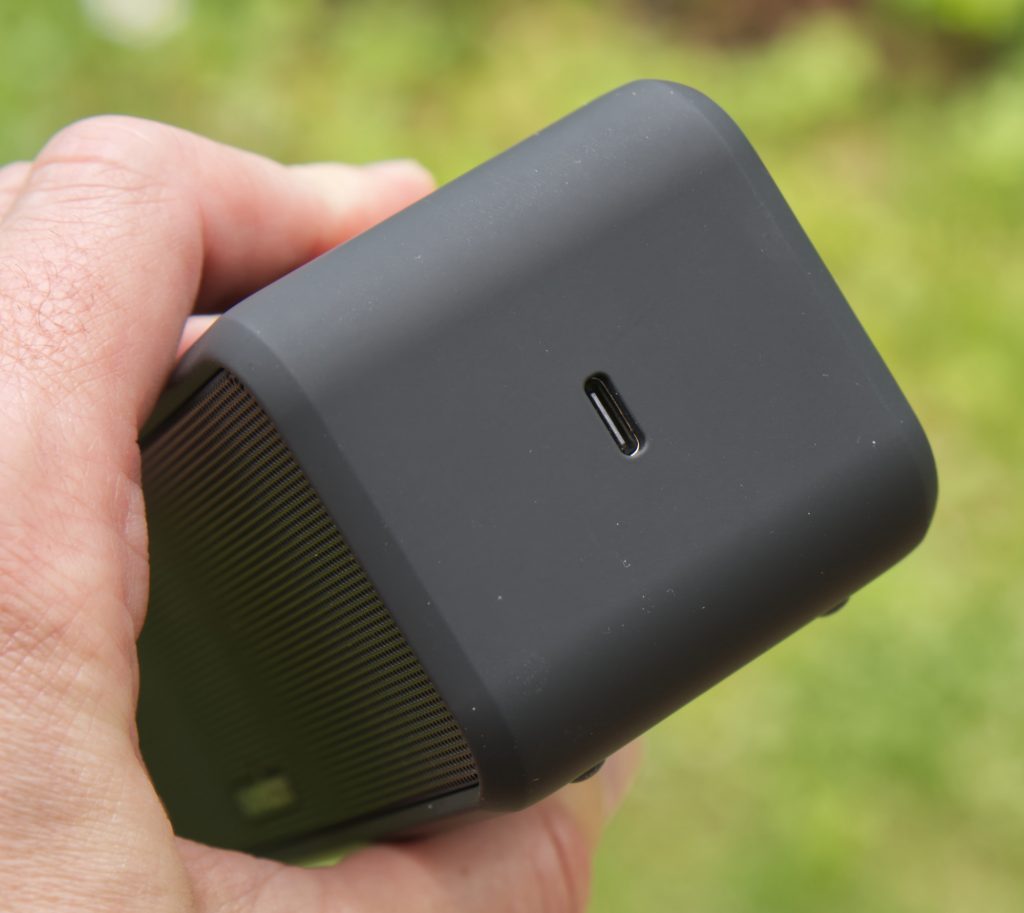 Najmanjši od testirane trojice je skoraj pravokotna škatlica, ki se na embalaži ponaša s pravimi poudarki, toda zmanjka ji pri tistem najbolj pomembnem dejavniku – zvoku. Zadeva je namenjena enostavnemu prenašanju naokrog, saj je tudi zelo lahka, in ob strani ima utor za pritrditev zaščitne vrvice. Zvočnika se ni se treba pretirano paziti, ker je oblečen v gumirano plastiko in ponuja zaščito pred vodo po standardu IPX7. Tako lahko pade tudi v bazen in bo še vedno nemoteno deloval. Po navedbah proizvajalca z enim polnjenjem baterije gode do 16 ur, kar je najbrž nekoliko pretirano ali pa vsaj izmerjeno pri zelo nizki glasnosti, toda med testom sem ga napolnil na začetku in potem morda še enkrat. To pa se počne prek priključka USB-C, brez težav z istim kablom (in polnilnikom) kot telefon, kar je zelo pohvalno. Priključek sicer ni zaščiten s kakšnim čepkom, zagotovo pa mora biti od znotraj, sicer zvočnik ne bi veljal za vodotesnega.