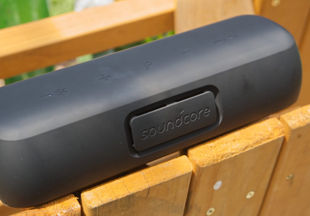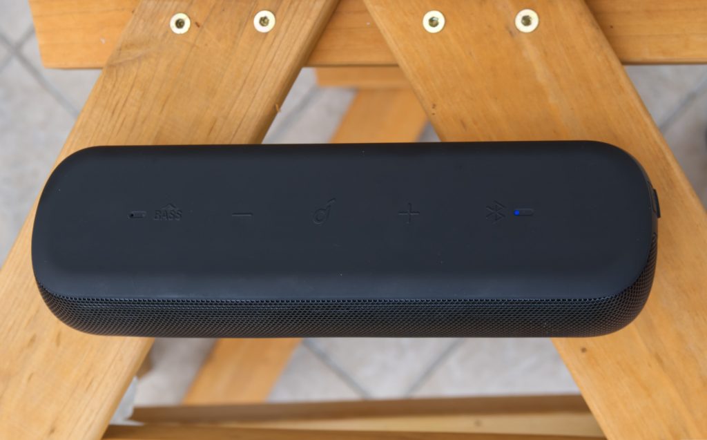 Motion+ je ležeč, podobno kot Soundcore 3, vendar ni pravokotne oblike, zvočniki so obrnjeni nekoliko navzgor, proti poslušalcu. Zadaj je kar velika odprtina, da basi lahko dihajo, vseeno pa je reč prav tako vodotesna po standardu IPX7. Priključek za polnjenje (USB-C) in vhod 3,5 mm sta zaščitena z gumijastim prekrivalom. Za baterijo podobno kot pri Flare Mini navajajo 12 ur avtonomije in ta številka zna kar držati, razen če nameravaš ves čas poslušati na najvišjih glasnostih. Tipka za vklop je tu ob strani, ostale pa na vrhu, kar pomeni, da jih uporabnik zaradi naklona ohišja v bistvu ne vidi, pa že tako ali tako so enako slabo čitljive kot pri ostalih dveh zvočnikih.