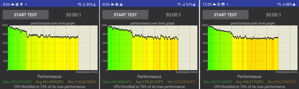 Pričakovano je novi procesor sumo borec, ki mu nikdar ne zmanjka moči. Vsaj dokler se pretirano ne segreje. Segrevanje je bilo in bo vedno težava, če se v nekem trenutku ne sprijaznimo z debelejšimi ohišji in visokim tonom hitro sukajočega ventilatorja ob večjih obremenitvah. 30-minutni obremenitveni test je tako pokazal padec do 70 odstotkov zmogljivosti. Kar je pričakovano glede na takte jeder. Lepšo sliko pokaže 30-minutno igranje igre Genshin Impact. Pri srednjih grafičnih nastavitvah (nad njimi je samo še ena raven) in 60 sličicami na sekundo, ni bilo opaziti kakršnega koli zatikanja pri prikazu slike in ker se je ohišje telefona opazno manj segrelo, kot v primeru testa z aplikacijo CPU Throttling Test, tudi padec zmogljivosti ni bil tolikšen.
