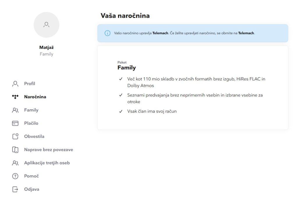 Naročniki Telemacha, ki so doslej imeli Tidal vključen – posamično naročnino, za družinsko so morali doplačati –, za zdaj še vedno vidijo v svojem uporabniškem računu, kar je treba pogledati na spletu, saj v aplikaciji ni vidno, da njihovo »naročnino upravlja Telemach.« V tem operaterju so se namreč odločili, da naročnine ne bodo ugasnili čisto takoj, temveč se bo to zgodilo 30. aprila. Po tistem jo bo treba prav tam, kjer se zdaj preveri njeno stanje (https://account.tidal.com/subscription), skleniti na novo neposredno s ponudnikom storitve in potem plačevati prek bančne kartice ali PayPala. Odsvetujemo sklepanje naročnin v aplikaciji na telefonu (izjemi sta Apple Music za naprave iOS in Youtube Music za androidne naprave), saj bo zaradi provizije Appla in Googla prek trgovin App Store in Play cena višja. Kdor bo naročnino na novo sklenil v obdobju dveh let, bo obdržal svoje knjižnice v storitvi Tidal. Kasneje bodo te izginile, povsem verjetno pa tudi sam uporabniški račun, kot se nam je zgodilo pri storitvi Deezer, ki smo jo plačevali pred leti.