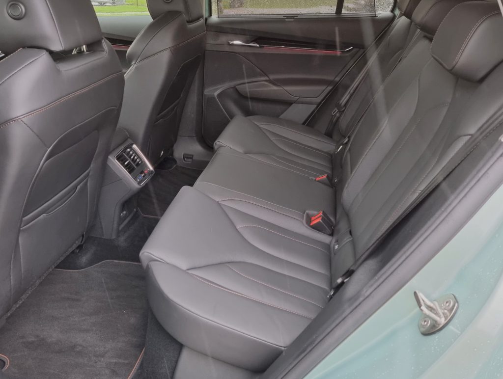 Novinec je deluje kar impozantno, pa vendar je oblika dovolj zašiljena, da je tudi aerodinamična. Količnik upora menda znaša 0,257 in za vetrni piš trdijo, da se ga sliši šele pri avtocestnih hitrostih. Kar lahko v veliki meri potrdim, avto je res tih, tudi pri 140 km/h ni kakšnega motečega hrupa. Prav tako se pelje zelo dobro in udobno, predvsem lepo pobira vse grbine, udrtine, neravnine in ostalo, nagibanja in zibanja skoraj ni, nisem pa imel priložnosti preizkušati dinamike v ovinkih. Avto sicer lahko stoji na kolesih, velikih od 18 do 21 palcev. Na voljo so tri stopnje zaviranja z motorjem, ki vrača nekaj energije v baterijo, med njimi se lahko voznik premika z lopaticama za volanom, vendar samo, kadar je »menjalnik« v položaju D. V načinu B je namreč že določen najvišji nivo »rekuperacije«.