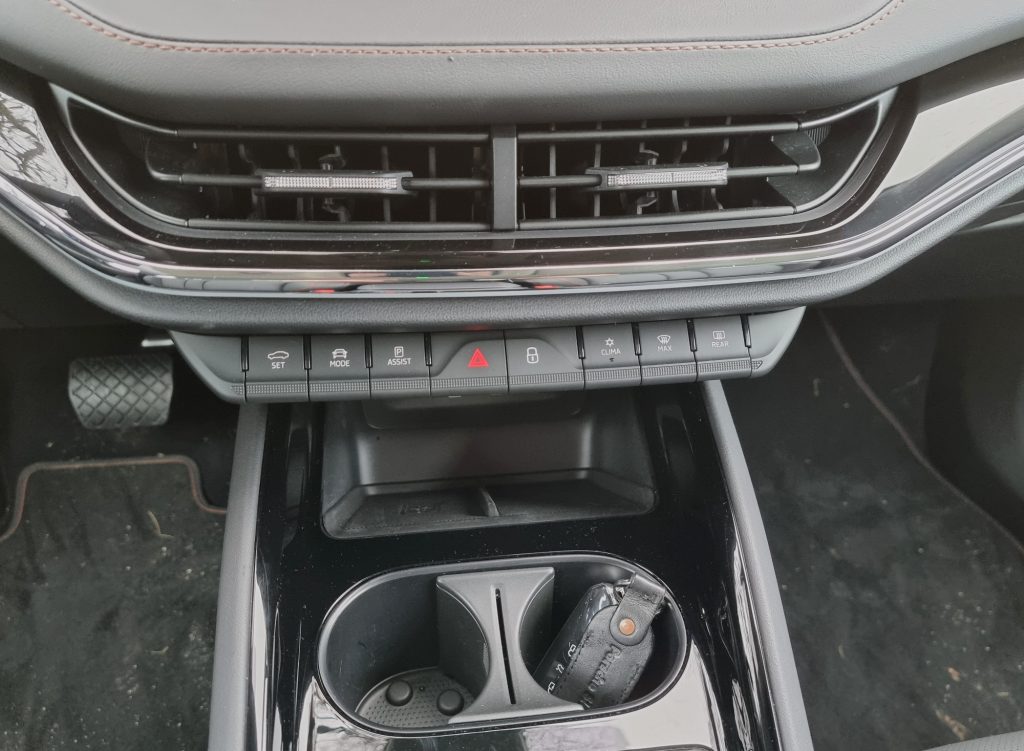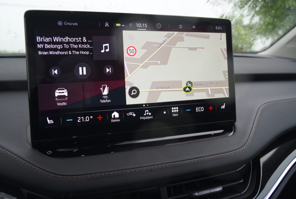 Prednost pred kakšnim drugim električnim pa zda biti v dokaj zadržanem notranjem dizajnu, povzetem po novi Octavii. Težko bi samo, če bi na hitro pokukal v Enyaqa, ugotovil, da je to baterijski avto. Volkswagen je pri liniji ID potegnil večjo ločnico, četudi končni rezultat z dokaj praznim interierjem in ne najboljšimi materiali ni vsem všeč. Tu je armaturna plošča in postavitev zaslonov precej bolj klasična, materiali delujejo prijetno, celo bolj kot v že velikokrat omenjenem prelomnem terencu. Na sredini kraljuje res velik zaslon, ki v diagonalo meri kar 13 palcev, le različica z najmanjšo baterijo je v osnovi deležna manjšega, 10-palčnega. Zaslon pred voznikom, velik 5,3-palce, pa je kar malo smešen. Deluje res majhno, pa tudi nobenega spreminjanja pogleda in prikaza informacij na njem nisem našel. Zelo evidentno so ga vzeli iz inventarja modelov ID in ga nekako vgradili, vendar rezultat res ni posrečen. Se pa na srečo da dokupiti prosojni zaslon (HUD), ki zna za voznika zadevo malo izboljšati.