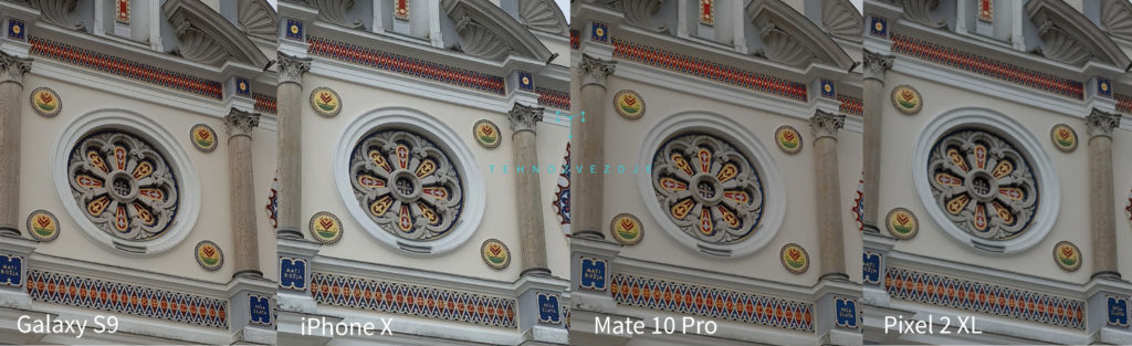 In če pogledamo podrobnosti, je znova spredaj Samsung. Napisi so najbolje vidni, veliko je detajlov v vitražih, na strebrih in tako naprej. Applova desetica ne zaostaja veliko, zaradi manjšega ostrenja in verjetno tudi manjšega tipala je vse skupaj za odtenek manj ostro. Mate znova zadeve prikaže malce manj jasno in določene strukture (denimo stebri) nimajo prav veliko podrobnosti, a na koncu, če gledamo fotografijo celozaslonsko, še vedno izpade čisto v redu. Kot tudi Pixel, ki pa ima tokrat manj jasne podrobnosti in več šuma.