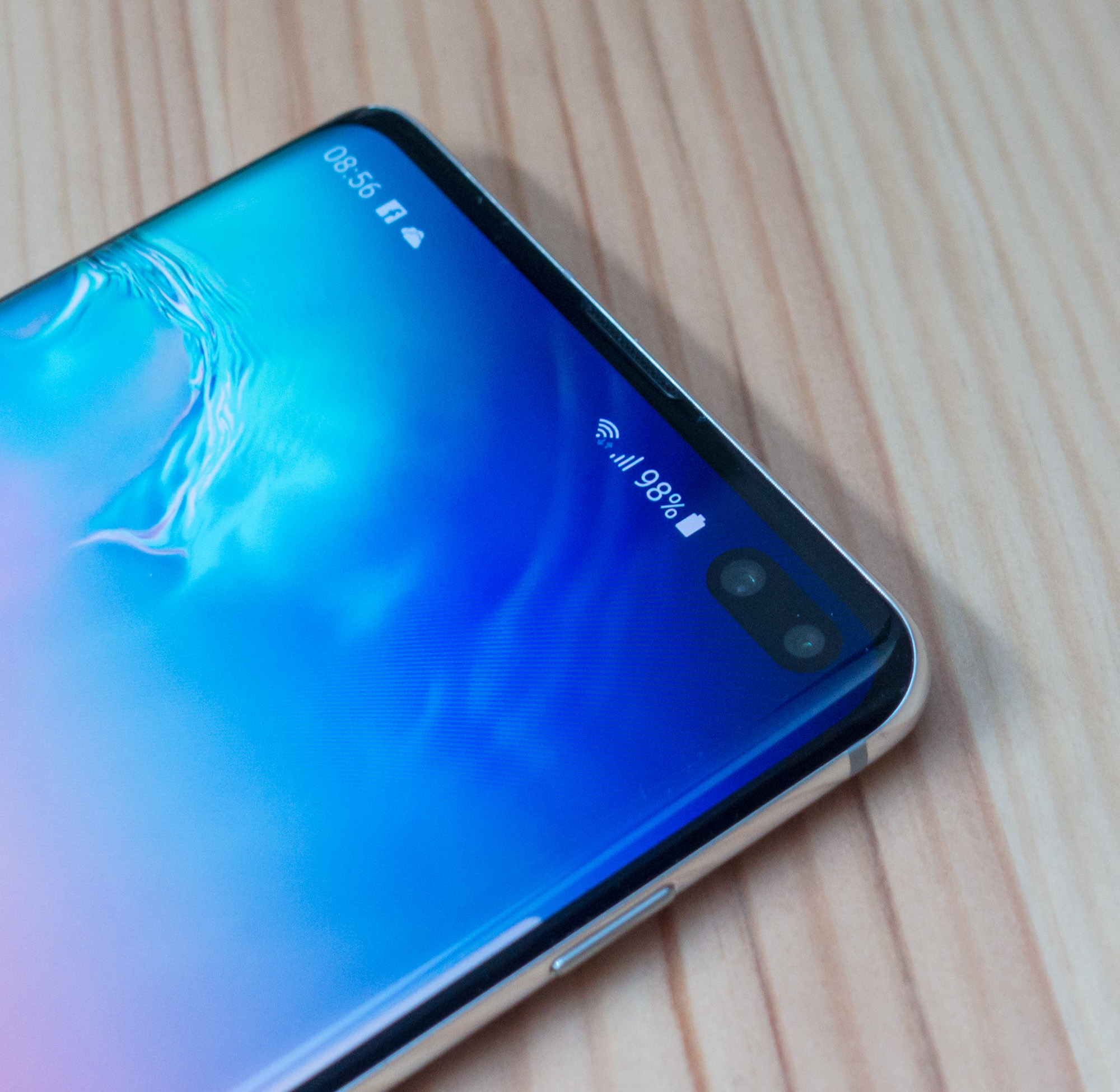 Na prvi pogled desetice niso dosti drugačne, sta pa najmanj dve ključni spremembi. Prva je čitalnik prstnih odtisov, ki je pri S10 in S10+ integriran v zaslon, pri S10e z ravnim zaslonom (ostala dva imata znova ob straneh ukrivljenega) pa ob strani, v tipki za vklop in izklop. O tem več kasneje, ker zahteva svoj odstavek in ker ne gre nujno za izboljšavo, četudi je bila prejšnja postavitev zadaj in blizu fotoaparata deležna veliko kritik, tudi mojih. Druga večja sprememba pa je postavitev sprednjega fotoaparata. Čeprav so zaslon potegnili še malo bolj proti vrhnjemu robu, so se izognili tako ali drugačni zarezi, ampak so se odločili za luknje v zgornjem desnem kotu. Cenejša dva imata enojen fotoaparat, zato je izrez dokaj majhen, s še vedno večji kot pri kakšnem drugem telefonu, denimo Honorju View 20. Plus pa premore dva objektiva, zato je ta luknja precej večja. Ni presenetljivo, da je zaradi tega med uporabo tudi bolj opazna, še posebej, ker se bolj zajeda v zgornjo obvestilno vrstico. Med gledanjem videa niti ne moti pretirano, se je pa ne da čisto ignorirat. Rešitev ni napačna, toda smiselno bi bilo, če bi se proizvajalci in Google vsaj dogovorili, kje naj bi bila ta luknjica. Honor View 20 jo ima na primer levo, kar pri videu pomeni levo spodaj, in ta lokacija mi je bolj všeč kot Samsungova levo zgoraj (v vodoravnem položaju telefona, če je »spodnji« del na desni). Še manj moteči pa sta Huaweijevi kapličasti zarezi na sredini, a sta zato P30 in P30 Pro na ošvrk manj prepoznavna.