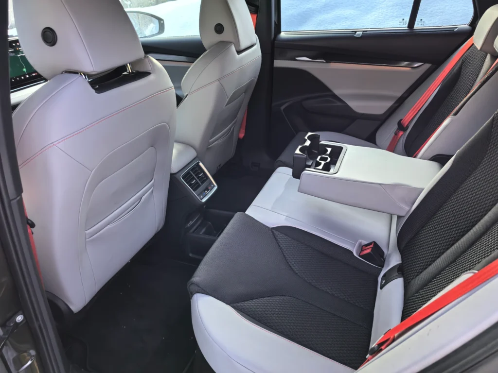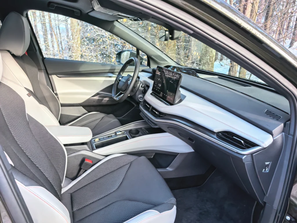 Še manj »sprememb« boš našel v potniški kabini. Postavitev zaslonov in zasnova sredinske konzole sta enaki, le na volanskem obroču se zdaj bohoti velik napis znamke. Ušesi sta brezpredmetni. Namenjeni sta prilagajanju stopnje rekuperacije v izvedbi SportLine. Očitno se je nekomu tudi zdela dobra ideja poigrati se z varnostnimi pasovi, ki so me ponovno presenetili v kričeči rdeči barvi. Brez dvoma poživi vizualni vtis, a bi se jim brez slabe vesti odpovedal.