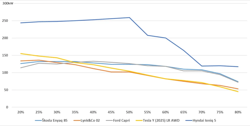 S prenovo je Enyaq dobil hitrejše polnjenje na izmenični tok, česar, roke na srce, nisem posebej opazil. Vsak dodani kilovat je sicer dobrodošel na daljši poti, a je krivulja polnjenja precej položna. Kar ni slabo, saj pomeni 24 minut za polnjenje od 20 do 80 odstotkov. To je šest minut manj od časa, potrebnega za ogrevanje baterije na primerno temperaturo. Postopek lahko zaženeš ročno na osrednjem zaslonu.