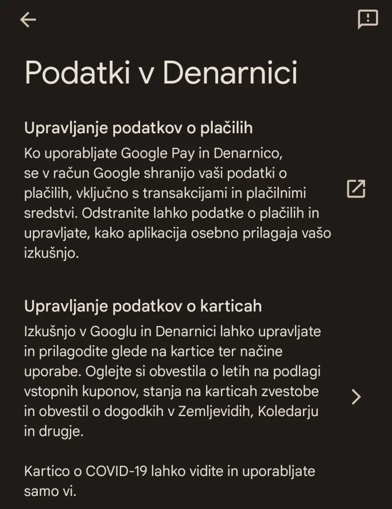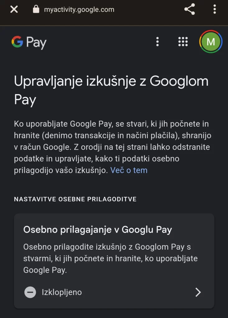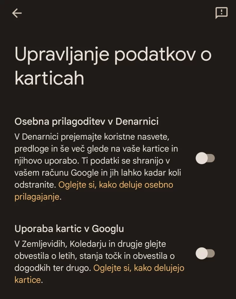 Če v Denarnici (Google Wallet) kliknete na svoj uporabniški račun v desnem zgornjem kotu (črko imena tega računa, pri meni je M), lahko med možnostmi vidite Vaši podatki v aplikaciji Denarnica. Tam se odpreta poti v dva razdelka – Upravljanje podatkov o plačilih in Upravljanje podatkov o karticah. Začnimo z drugim. Tam notri lahko izklopite, da Google uporablja podatke iz uporabe kartic za dajanje personaliziranih predlogov (označuje jih za »koristne«). To je podobno kot posamezniku prilagojeni oglasi na osnovi njegovih zanimanj na spletu in v aplikacijah. Kot drugo pa lahko izključite še uporabo različnih točk in drugih podatkov v aplikacijah, kot so Zemljevidi, Koledar in druge Googlove. Že s tem dvojim dosežete, da se podatki o transakcijah ne shranjujejo v vaš račun pri Googlu. Seveda lahko kdo trdi, da jih omenjeno podjetje kljub vsemu »vidi« in morda celo obdeluje, vendar nimam potrditve, da to drži. In če jih ni v arhivu računa, jih načeloma ne bi smeli povezovati z uporabnikom, tudi če delajo profiliranje brez dejanskega imena.