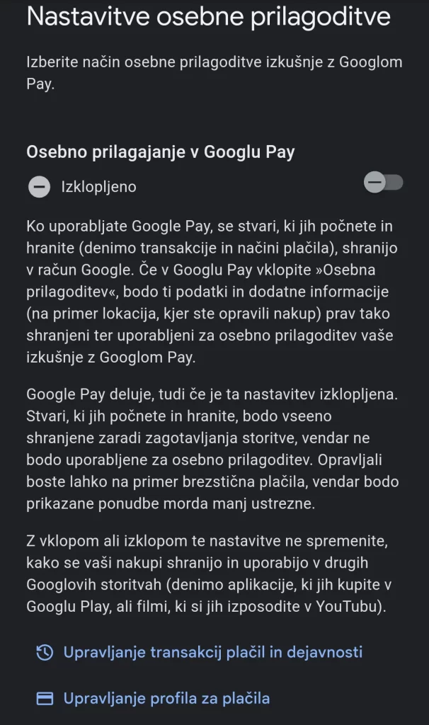 V razdelku Upravljanje podatkov o plačilih lahko vidite, katere transkacije so v resnici na spisku. Če v prej omenjenem razdelku izključite »osebno prilagajanje«, jih ne bi smelo biti. Pri meni so denimo samo tri iz let 2018 in 2019, ko sem očitno prek sistem Google Pay nekaj plačal v spletnih trgovinah, še preden sem izključil »personalizacijo«. Tiste transakcije, ki so notri, je mogoče ročno izbrisati. Nisem prepričan, da bo koga od tistih, ki so razburjeni zaradi Googla še v denarnici, opisano kaj pomirilo, a dejstvo je, da bodo tudi tu verjetno veliki igralci prevladali. Ni namreč niti smotrno niti smiselno, da bi vsaka (najmanjša) banka razvijala svojo mobilno denarnico, še posebej, če naj deluje na kar največ napravah (vključno z urami) in če (dobro delujoče) rešitve največjih globalnih korporacij že obstajajo.