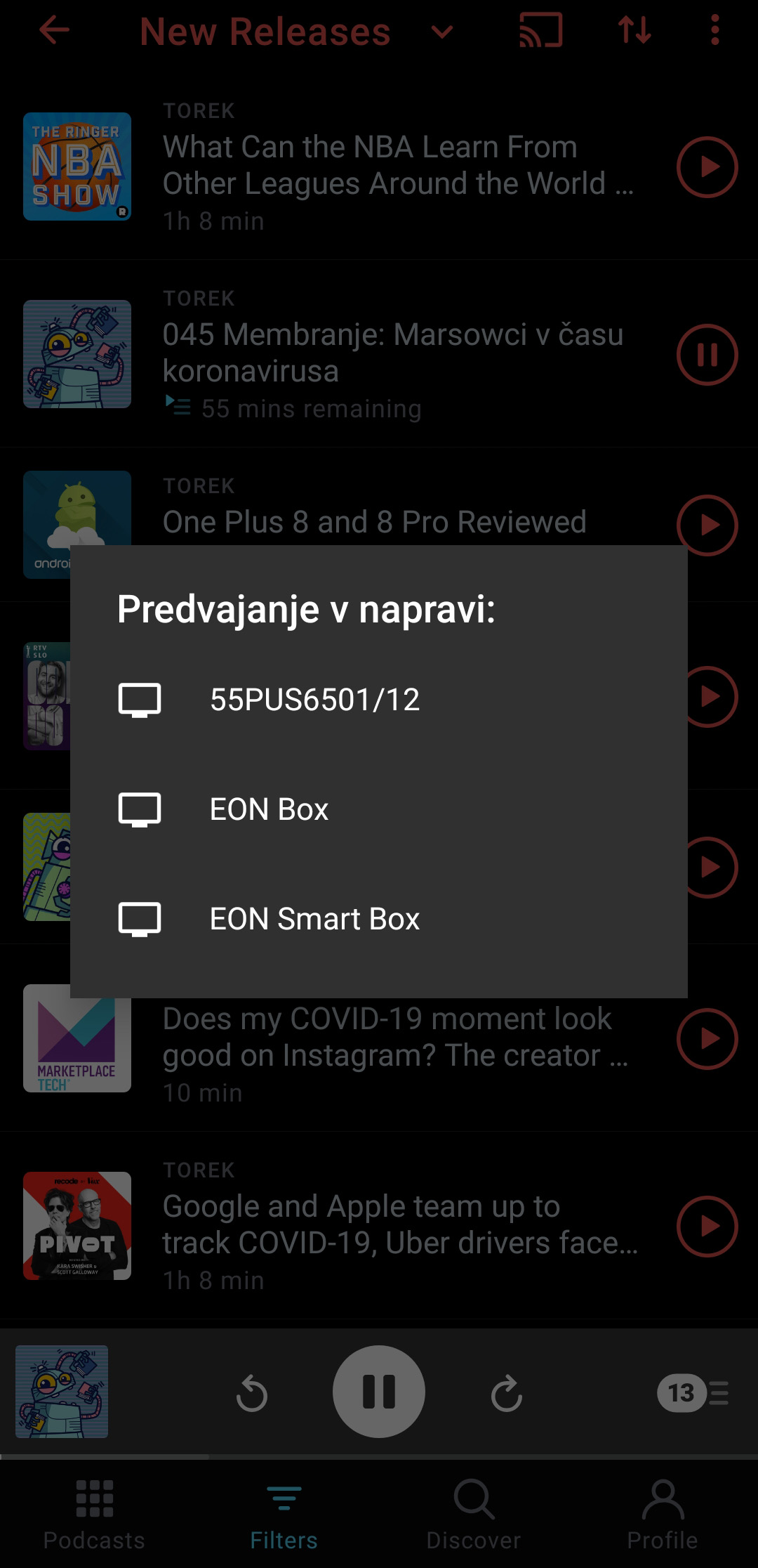 Podobno kot pri nasvetu s storitvijo Snapdrop je ključni in pravzaprav edini pogoj, da sta napravi v istem brezžičnem omrežju, česar doma seveda ni težko doseči. Na telefonu ali tablici je treba pritisniti na ikono za Chromecast (obkrožena na posnetku zaslona). Zdi se mi, da naj bi prikazovala ekran z brezžičnim signalom. Potem pa izbrati napravo, kamor naj se muzika (ali podkast ali karkoli že) predvaja. Na televizorju se prekine, kar je prikazoval dotlej, in čez nekaj sekund se zasliši tisto, kar je prej predvajal telefon oz. tablica. Na velikem ekranu pa se prikaže grafika aplikacije, iz katere vse skupaj poteka. Mobilna naprava postane daljinski upravljalnik, glasnost pa se da kontrolirati tako z njo kot na televizorju oz. sprejemniku. V brskalniku Chrome je ta funkcija v izbirnikih, ki jih odpre klik na tri pikice v desnem zgornjem kotu. Reče se ji Cast. V kakšnem drugem, denimo Vivaldiju, pa je v meniju z desnim klikom (miške oz. sledilne ploščice) izbira Preklopi. V obeh primerih se prikaže seznam možnih naprav, enako kot na telefonu, in po potrditvi začne zvok prihajati iz zvočnikov, povezanih s televizorjem. Gre pa v tem primeru na zaslon tudi slika tega zavihka, v katerem je zvočna vsebina. Seveda se da na izhodiščni napravi vmes početi karkoli drugega, na televizorju pa ni mogoče mimogrede gledati še česa drugega. Če gre uporabnik »ven« iz tega načina, se vse skupaj prekine. To je torej za takrat, ko želimo imeti zvočno kuliso in ne potrebujemo televizorjevega ekrana.