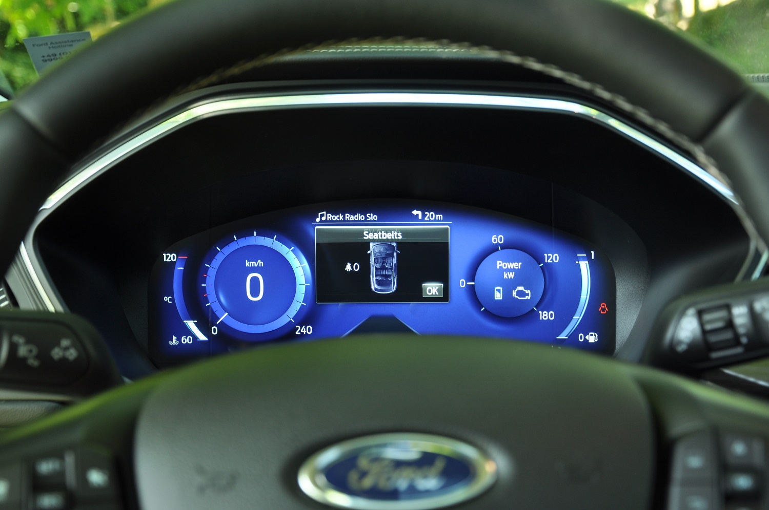 Za doplačilo je na voljo tudi prilagodljiv (po višini in po svetilnosti) zaslon v višini oči, z uporabnimi podatki, kot so na primer hitrostne omejitve, vendar mi Fordova izvedba bi najbolj pri srcu. Namesto da bi bil zaslon v armaturni plošči obrnjen navzgor, da se slika zrcali na vetrobranskem steklu, gre tu za opazno prozorno plastično ploščo, postavljeno pravokotno na smer pogleda, ki prikazuje podatke.