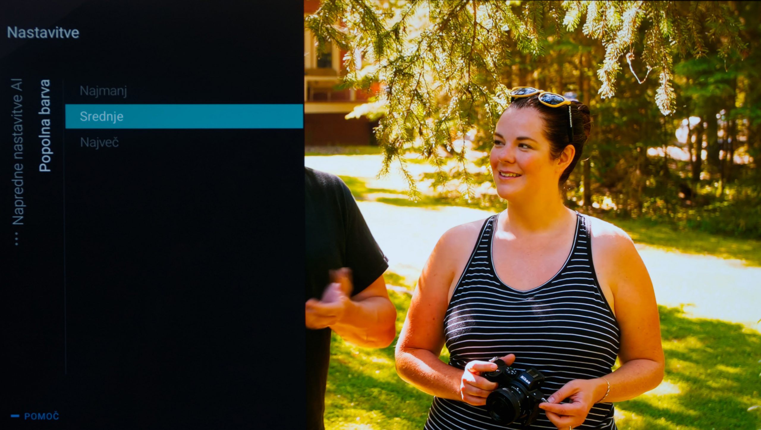 Težje je dati pravi nasvet za kontrast in barvo. Težava, ne ravno velika, a opazna, je namreč v tem, da je skok z nizke na srednjo vrednost pri obeh parametrih prevelik. Kontrast vpliva na to, koliko je slika svetla, in pri najnižji nastavitvi je lahko nekoliko pretemna, pri srednji pa že malce presvetla in določene bele točke preveč izstopajo, še posebej, če vir ni v načinu HDR. Barve pa so na nizki vrednosti nekoliko anemične in nekako ne pritičejo zaslonu OLED. Toda na srednji so določeni odtenki že pretirani. Denimo obrazi postanejo malce rdeči, trava pri nogometu živo zelena in podobno. S svojimi nastavitvami (denimo s prilagajanjem sloga Osebno) se da, kot rečeno, priti do ravno tistega vmes, česar AI ne ponuja. Je pa res, da je potem nastavitev statična in je umetna inteligenca ne prilagaja vsebini. Ta dinamika je sicer še bolj v začetni fazi, se pa kdaj opazi, sploh pri kontrastih, pa tudi barvah. Vsekakor bi bilo v redu, če bi bile razlike med tremi nivoji manjše, kajti možnost največ je popolnoma prehuda in bi bilo vseeno, če bi srednje spremenili v največ, vmes pa dodali še eno stopnjo. Lahko bi jo dodali tudi sicer, a se strinjam z zamislijo, da so tri stopnje več kot dovolj in da bi povečevanje na štiri ali celo pet izničilo poskus ponuditi bolj enostavne nastavitve.