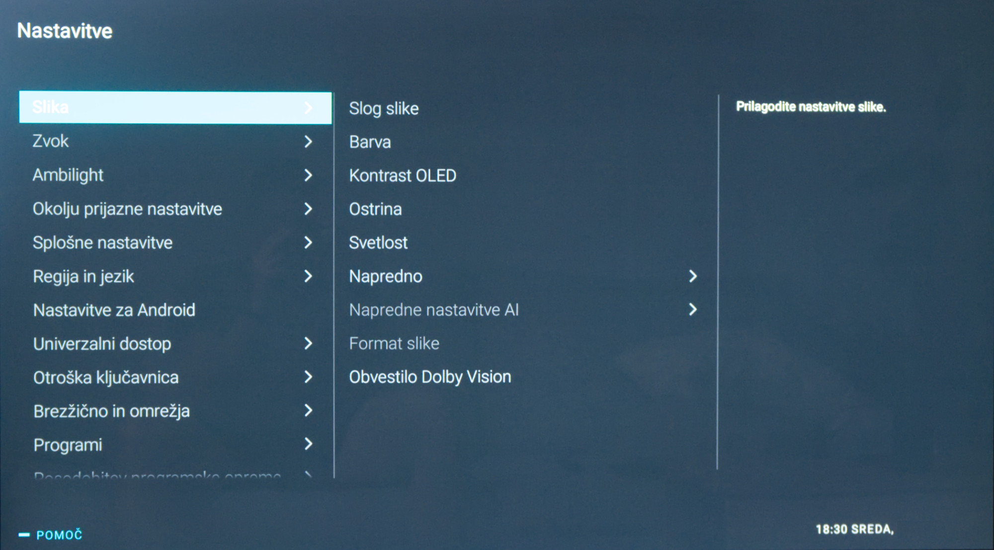 Vsekakor pa je takrat, kadar je vir v načinu Dolby Vision, najbolje izbrati slog Dolby Vision svetlo in ga morda še malce prilagoditi po svojih željah. Takrat se televizor pokaže v najlepši luči. Svetilnost je dobra, barve zelo naravne, še posebej kožne, tudi celotna obdelava pri televizorjih Philips še nikoli ni bila tako neagresivna. Všeč mi je, da je TP Vision počasi omilil svoj pristop, saj so zdaj tudi filmi veliko lepši, manj »umetni«, kot so bili nekoč.