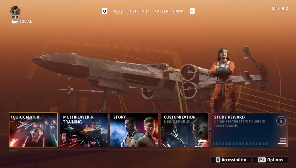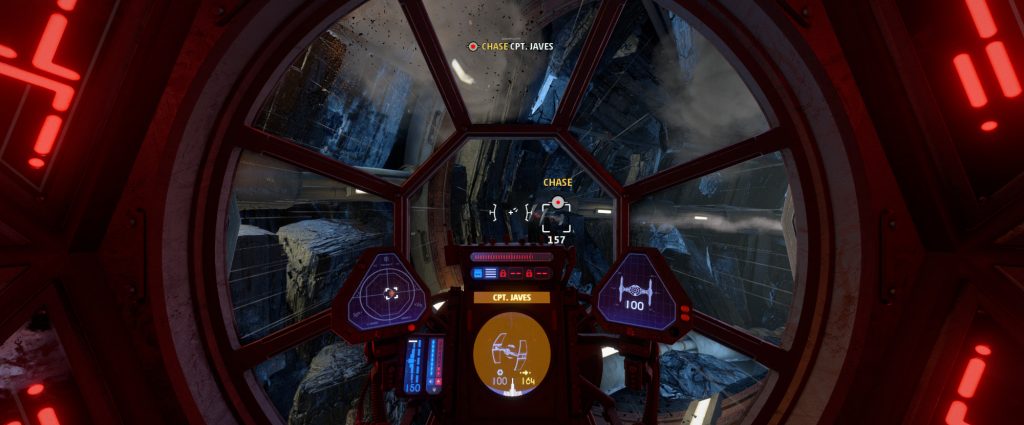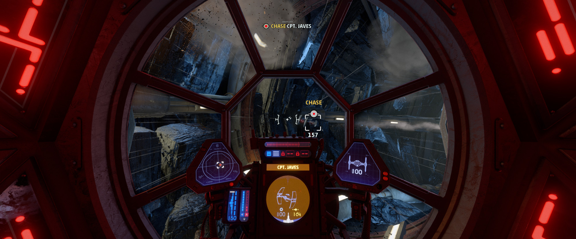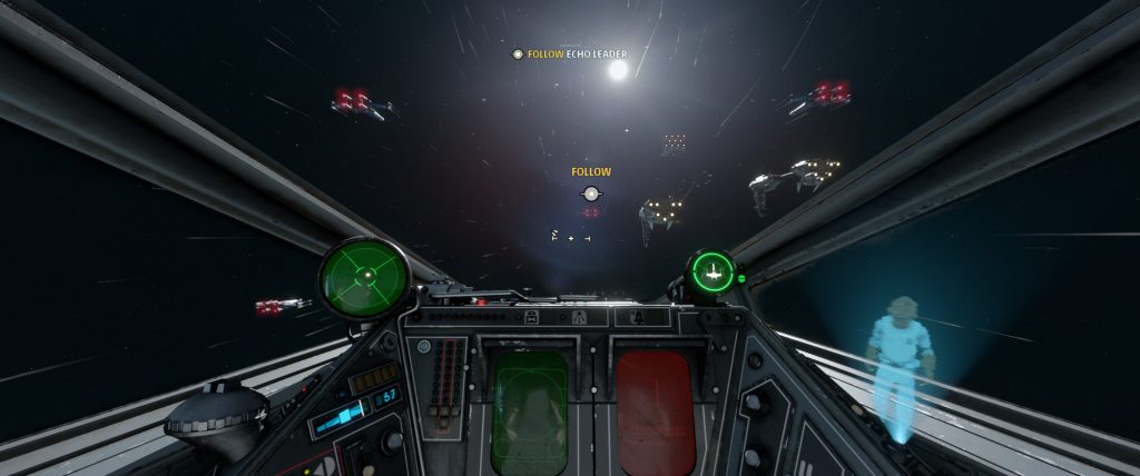 Ljubitelji Vojne zvezd pa se lahko usedejo v bojno ladjo in gredo v zračni boj v Star Wars: Squadrons. Lahko se odločijo, da se sami podajo na misijo, skozi katero jih vodijo računalniški liki, lahko pa sodelujejo v pravem boju zvezdnih bojevnikov pet na pet. Prva možnost je ne začetku morda celo preveč umirjena, a po prvem preobratu se počasi razživi. Druga pa je toliko bolj dinamična.