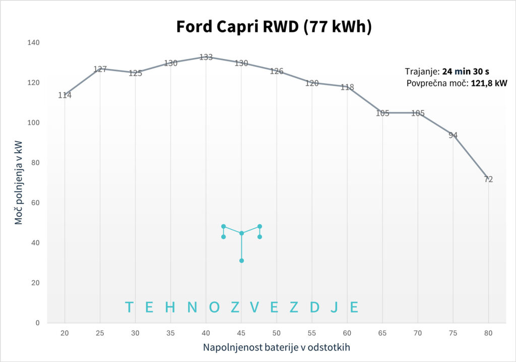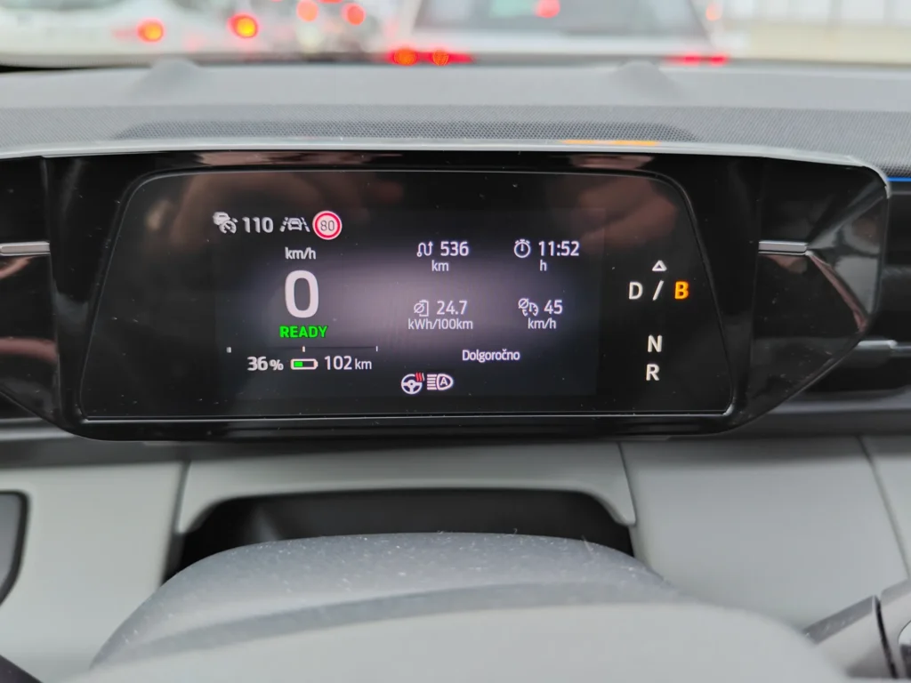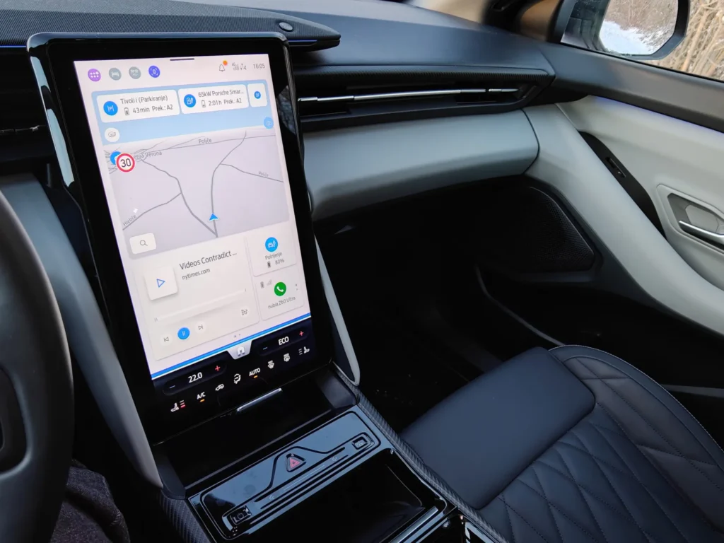 Lepota električnega avta pozimi, tudi če je deset stopinj ali več pod ničlo, kot je bilo tisti teden, je v možnosti predhodnega segrevanja in hitrega odmrzovanja stekel. Tu se je celo izkazala kot polovično smiselna odločitev, da zadaj ni brisalca, kajti lažje je bilo odstranjevati ledene kose, potem ko so toliko odstopili, da so se pustili premakniti. Spredaj sem moral kar pogosto segrevati vetrobransko steklo, ker je vse skupaj sproti zmrzovalo, a to ni nikakršna težava. Posledično me seveda tudi zeblo ni, čeprav sem bil zgolj v puloverju. V bundi bi se skuhal. Slaba stran je zgolj visoka poraba, ta je v določenem obdobju, malo po začetnem segrevanju kabine, ko smo se po polžje prebijali skozi Ljubljano in ko sem že imel vključeno tudi segrevanje baterije za ultra hitro polnjenje, prilezla do najvišje vrednosti, kakršno prikaže zaslon (99,9 kWh). Na koncu se je ustalila nekje med 30 in 40 kWh, ob koncu testiranja, po nekaj več kot 500 km pa malo pod 25 kWh na 100 km. Predvidevam, da bi brez segrevanja baterije in skozi malce daljše, bolj reprezentativno obdobje, lahko bila nekje med 21 in 23 kWh na 100 km. Omenjeno polnjenje je po več kot uri segrevanja baterije, zaradi česar je ta imela optimalno temperaturo tudi sredi najhujše zime, od 20 do 80 odstotkov trajalo manj kot 25 min. Še druga, manj pomembna slaba stran pozimi, je ta, da se razen stekel nič drugega na avtu ne odtaja, ker pač ni »grelnega telesa,« kakršen je motor z notranjim zgorevanjem.