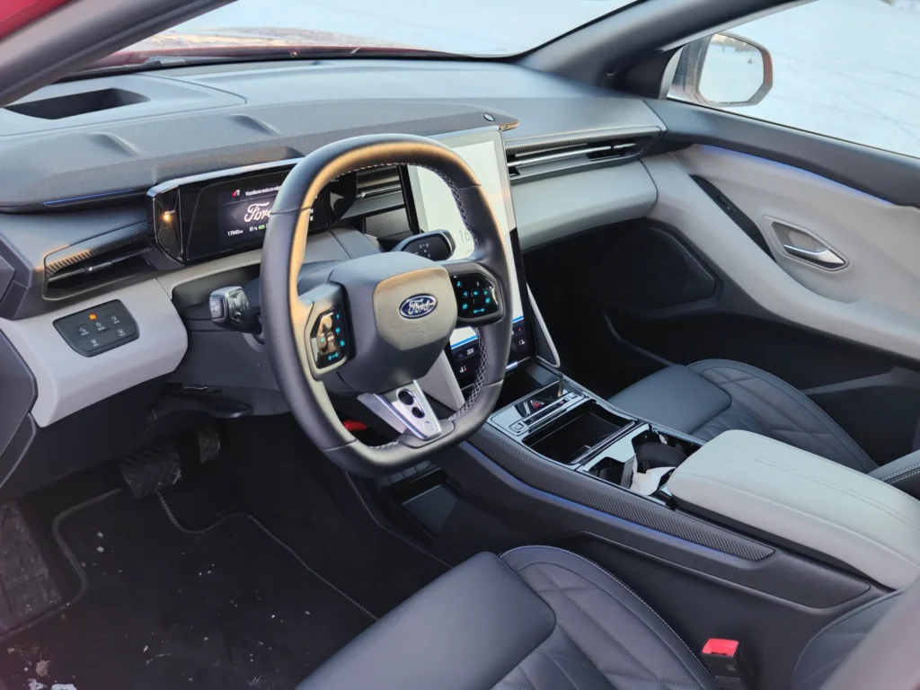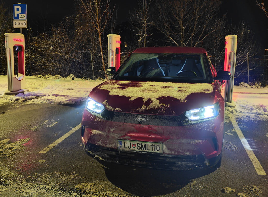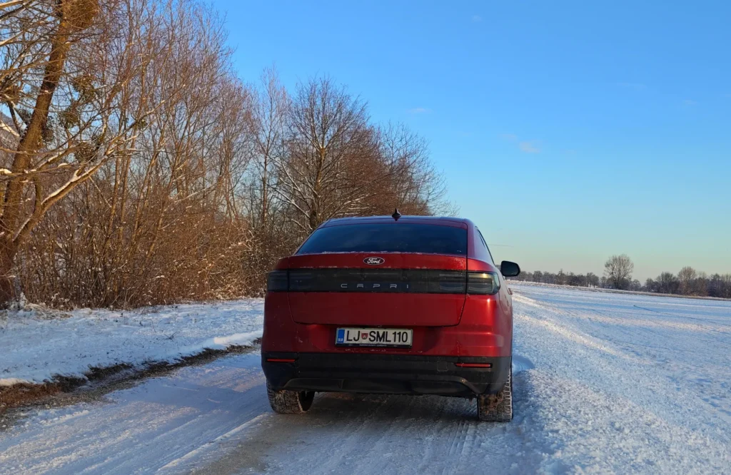Na srečo imam dovolj izkušenj v vozili na Volkswagnovi platformi MEB, tudi s temi z novejšim, dokaj zmogljivim motorjem (210 kW), ki res lepo zvezno podaja moč in pri katerem v običajnem voznem načinu skoraj ni mogoče »kopati« z zadnjimi kolesi, je pa dobrodošla malce nežnejša noga ob začetku speljevanja, da potnikov ne »cukne« preveč ali da kolesa v snežnih razmerah ne izgubijo oprijema oz. se ne zakopljejo preveč v novozapadlo odejo. Pnevmatike so bile tu kar 21-palčne, največje v ponudbi pri dotičnem modelu, in tudi precej široke, zaradi česar me je sprva nekoliko zaskrbelo, vendar se je izkazalo, da to ne predstavlja prav nikakršnega problema. Morda je še celo bolje, kot če bi bila kolesa manjša (ožja bi v specifičnih primerih vseeno utegnila biti bolj primerna), kajti avto je tudi po zasneženih klancih, navzgor in navzdol, šel enako suvereno kot po ravnini. Z več vidikov, sem štejem tudi vožnjo čez luknje (teh na slovenskih cestah ne manjka) in stabilnost, se mi v zadnjih letih potrjuje, da, podobno kot pri gorskih kolesih, večanje platišč nima izključno vizualnega ozadja. Edino, kar se na zasneženi cesti res ni obneslo, je Fordova interpretacija »potovalnega pomočnika,« ki naj bi poleg samodejnega prilagajanja hitrosti oz. razdalje še skrbel za vožnjo po sredini pasu. Toliko so ga motile kolesnice v snegu, da sploh ni vedel, kaj naj počne. Na suhi cesti je bilo bolje, a tudi takrat ne zelo prepričljivo. Zato pa aktivni ohranjevalnik hitrosti, brez ostalih dodatkov, vozi izjemno lepo.