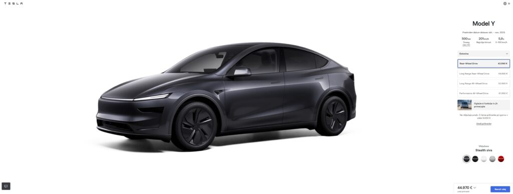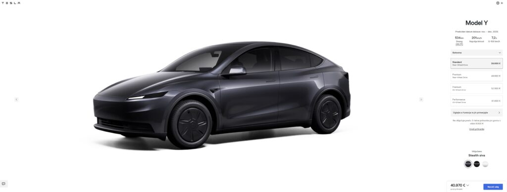 Po dolgem pričakovanju, kdaj bo Tesla predstavila cenejši avtomobil »za množice« in priznanju Elona Muska, da bo vsaj za zdaj to zgolj okrnjeni Model Y, je podjetje v konfigurator dodalo različico Standard in odvzelo prej (najbolj?) priljubljeno izvedbo RWD. Nova je za štiri tisočake cenejša in bolj špartansko opremljena, a ima tudi vsaj eno izrazito prednost. Ni pa (še?) podobne izvedbe Modela 3.