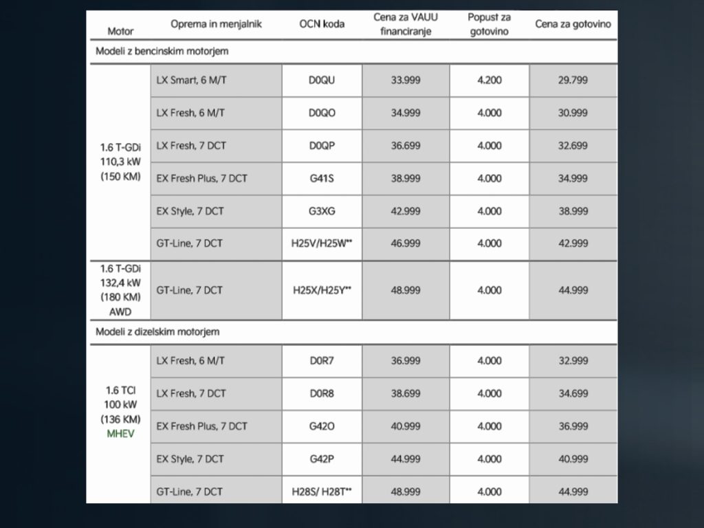 Cene so v mejah, ki trenutno veljajo za vozila v segmentu C-suv (z izjemo kitajskih modelov). Za Sportage z bencinskim motorjem boste v primeru odločitve za njihovo financiranje odšteli od 33.999 evrov in za dizla od 36.999 evrov naprej. Če se odločite za plačilo z gotovino, kar je redkost, potem priznajo popust v višini štiri tisoč evre.