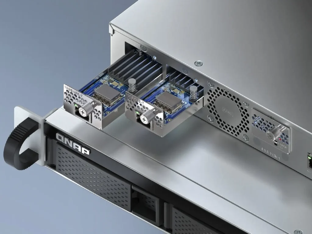 - Tri reže E1.S/M.2 PCIe NVMe – možnost namestitve do dveh omrežnih modulov QNAP QXG-ES10G1T E1.S (10GbE) ali treh SSD-jev E1.S/M.2 2280 za hitro SSD shranjevanje in predpomnjenje (povečanje IOPS).