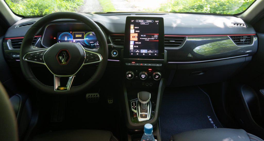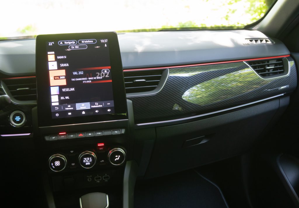 Ko potniki vstopijo v Megana Conquest, jih pričaka podobno okolje kot v Capturju ali Cliu, z obveznima zaslonoma. Pokončnim na sredini armaturne plošče in pri nekaterih različicah še tistim pred voznikom, pri katerem še vedno pogrešam nekaj več možnosti prilagajanja vsebine in svetlo temo namesto konstantne črne. Materiali se zdijo v redu, oprema RS Line doda še nekaj barvnih detajlov. Nisem čisto prepričan, ali doda tudi črno oblazinjenje strehe, če ga, potem bi se osebno tej opremi izognil. Že osnovna oprema Zen je sicer kar solidna, doda pa srednja možnost Intens (za dodatna dva tisočaka) še prilagodljivi regulator hitrosti, funkcijo samodejnega držanja v klancu, usnjen volan, samozatemnitveno ogledalo, samodejni vklop in izklop dolgih luči, dodatno zatemnjena stekla zadaj, omenjeni zaslon pred voznikom, večji osrednji zaslon, brezžično polnjenje telefona in še nekatere dodatke. Vsekakor dovolj koristnih zadev, da se splača poseči po tem nivoju.