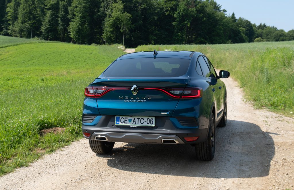Novinec je nekoliko nenavadna izpeljanka. Zasnovan je na konstrukcijski osnovi CMF-B, ki si jo delita Clio in Captur, torej manjša avta od Megana. Toda Megane Conquest je bistveno daljši, v dolžino namreč meri skoraj 4,57 m in je tako blizu karavanskemu Meganu Grandtour. Je tudi daljši od Kadjarja in bolj prostoren od tega »terenca« v kabini ter na podobnem nivoju glede prtljažnega prostora. Slednji namreč znaša 513 l pri bencinskih izvedbah (blagih hibridih) in 480 l pri hibridni različici, če je v dvojnem dnu zgolj komplet za popravilo pnevmatik, z rezervno gumo pa se uporabna prostornina občutno zmanjša. Nenavaden je ta avto tudi zaradi oblike. Že po višini je z malo manj kot 1,58 m nekje vmes med klasičnimi kombilimuzinami in SUV-ji. Nasajen je dokaj visoko, saj je odmaknjenost od tal 20 cm. Zadek, ki se kombilimuzinsko spušča in zaključi kupejevsko, pa spominja na poskuse prestižnih znamk, kakršnih doslej pri modelih za množični trg nismo videli prav veliko ali pa sploh nobenega. Izpade precej zanimivo in zanesljivo izstopa, na srečo tudi ni tako pretirano dimenzionirana kot kakšen BMW X6 ali X4.