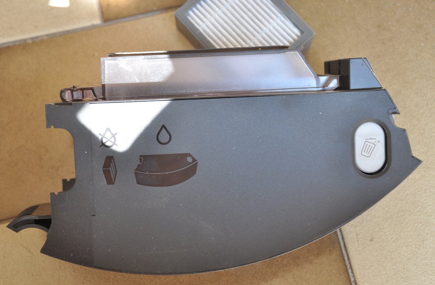 Še največjo spremembo je doživela posoda za smeti. V njej ni več motorja in ventilatorja, premeščena sta v desni del ohišja robota. Še vedno pa je ventilator enako velik kot pri 780tici in glede tega ocenjujem, da ima epetka približno enako moč sesanja. Ker ni motorja lahko posodo speremo z vodo, a moramo prej ven vzeti filter, ki ni pralni. Škoda, kajti odstranjevanje prahi iz reber filtra je najbolj zoprni del vsakotedenskega vzdrževanja in tu bi curek vode bolj prav prišel, kot za spiranja posode iz plastike. Če nekaj delcev prahu ostane v posodi, robot ne sesa nič slabše, če pa je v gubah filtra prah, to vpliva na kakovost njegovega dela.