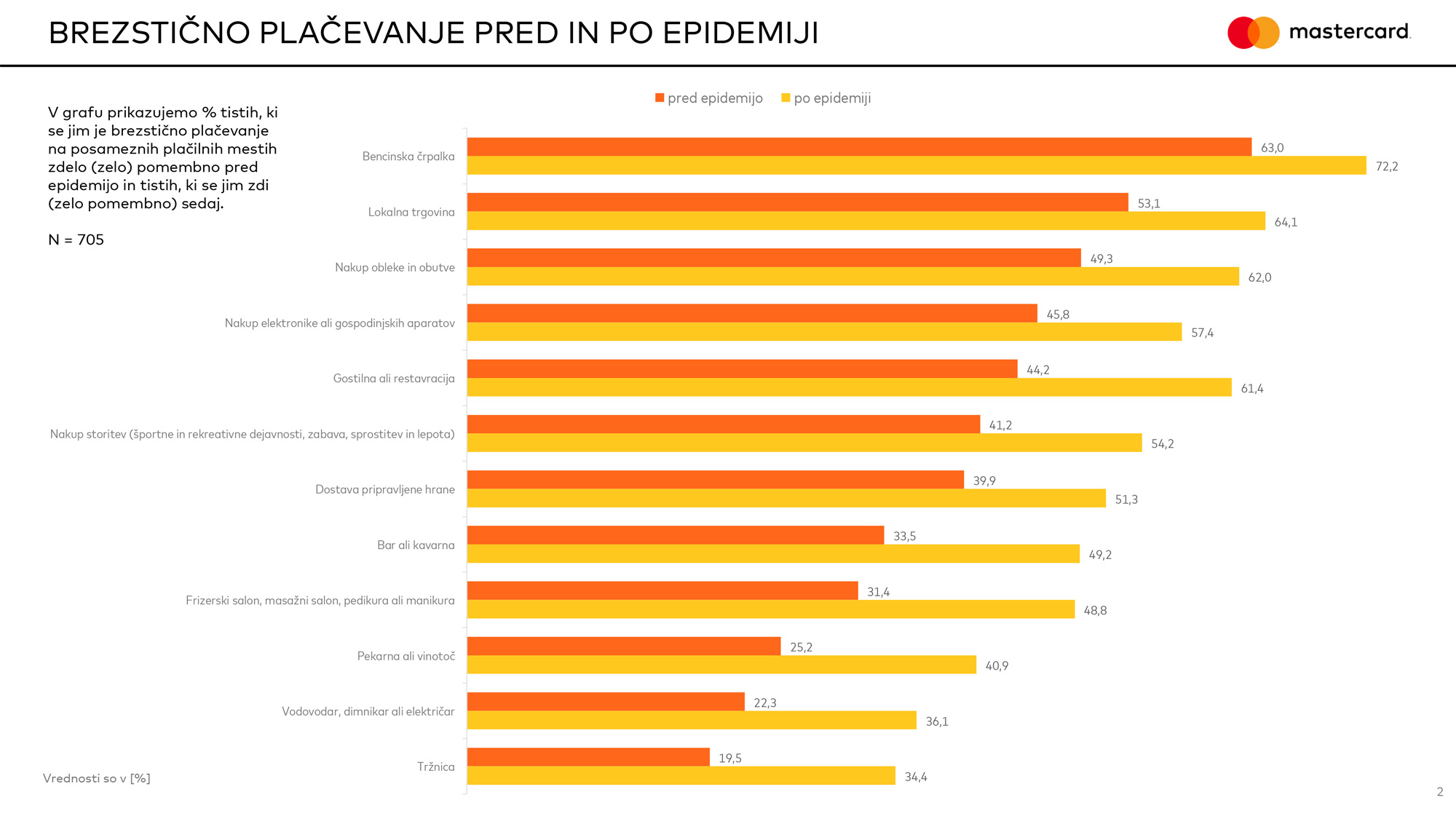 Zanimivi so tudi podatki, kje je kupcem brezstično plačevanje najbolj pomembno. Prednjačijo bencinski servisi. Sledijo vrtnarije, lokalne trgovine ter nakupi oblačil in obutve, raste pa tudi potreba po tovrstnem plačevanju v gostilnah in restavracijah, barih in kavarnah ter pri ponudnikih lepotnih storitev. Največji porast spletnih transakcij je (bil) dostavi hrane, kjer se je število povečalo za 25-krat, in trgovinah z živili, kjer je bilo povečanje v primerjavi z aprilom 2019 13-kratno.
