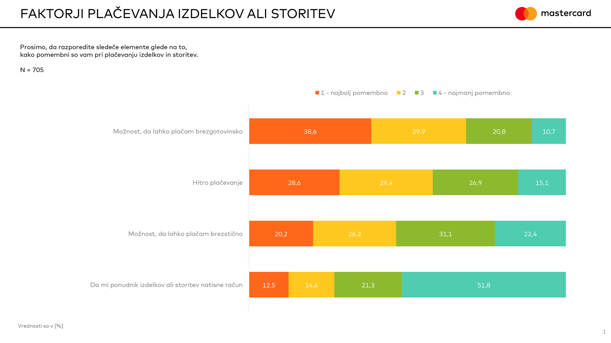 Po podatkih Mastercardove raziskave je pri plačevanju potrošnikom najbolj pomembna možnost brezgotovinskega plačevanja, ki jo na prvo mesto postavljata dve petini vprašanih, sledita hitro plačevanje (29 odstotkov) in brezstično plačevanje (20 odstotkov). Če kartic ne bi sprejemali kot možnosti plačila, bi to od obiska odvrnilo slabo četrtino vprašanih. Ta podatek se mi zdi kar realen in tudi precej poveden. Tega vprašanja in tolikšnega deleža pritrdilnih odgovorov ne bi bilo, če ne bi še obstajalo veliko prodajnih mest brez možnosti brezstičnega plačevanja ali celo brez terminalov POS in je edini način za plačilo gotovina. To se res mora spremeniti in če ne gre drugače, mora nekdo prisiliti ponudnike, naj se opremijo s terminali POS.