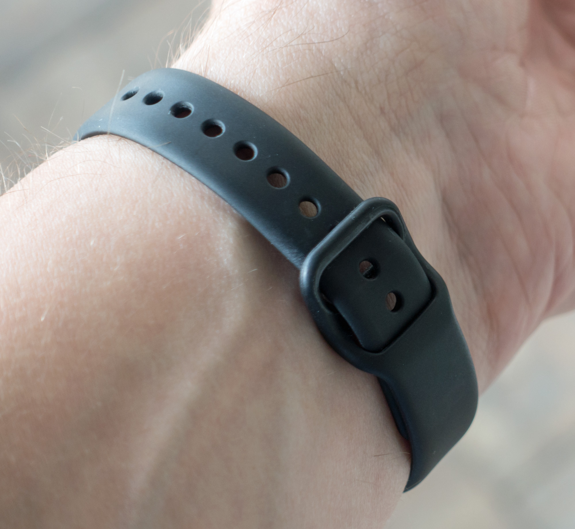 Mogoče je izgled dokaj klasičen in ne prav posebej izstopajoč, ne dosti drugačen od konkurenčnih zapestnic, še posebej ene zelo priljubljene kitajske, a hkrati nevsiljiv (Gear Fit je mogoče celo preveč bodel v oči) in dovolj estetski, da je mogoče zadevo nositi ob skoraj vsaki priložnosti. K temu zagotovo pomaga kovinska obroba zaslona, vsaj dokler ne dobi preveč prask, ki so žal neizbežne. Nanjo sta pritrjena oba dela gumiranega paščka, ki sta zamenljiva, kar je tudi fino, saj se ta silikon prav tako odrgne in vsem ne ustreza enaka velikost paščka. Pri testni zapestnici sem denimo kljub mojemu ozkemu zapestju moral uporabljati drugo ali tretjo luknjico, če bi imel nekoliko močnejšo roko, bi mi že zmanjkalo možnosti. Všeč mi je, da je zapenjanje izvedeno z vtikanjem enega dela paščka v luknjice na drugem delu, ker me take zapestnice precej manj motijo, kadar roko nekam naslanjam od onih, ki uporabljajo klasično urarsko zaponko. Toda sama izvedba je zoprna, ker je treba preostanek ne preveč upogljivega paščka vtakniti v luknjo, potem pa še spraviti ven ob jemanju zapestnice z roke. Pri cenejši Fit e, ki je sicer v celoti plastična, je del z zaponko premičen, kar precej olajša celotno proceduro jemanja z roke. Tudi zgornji del bi bil lahko malenkost tanjši, a ne glede na vse to je nošenje udobno, material paščka pa ni povzročal kakšnih srbečic ali drugih znakov na koži, kar se občasno dogaja pri cenejših zapestnicah.