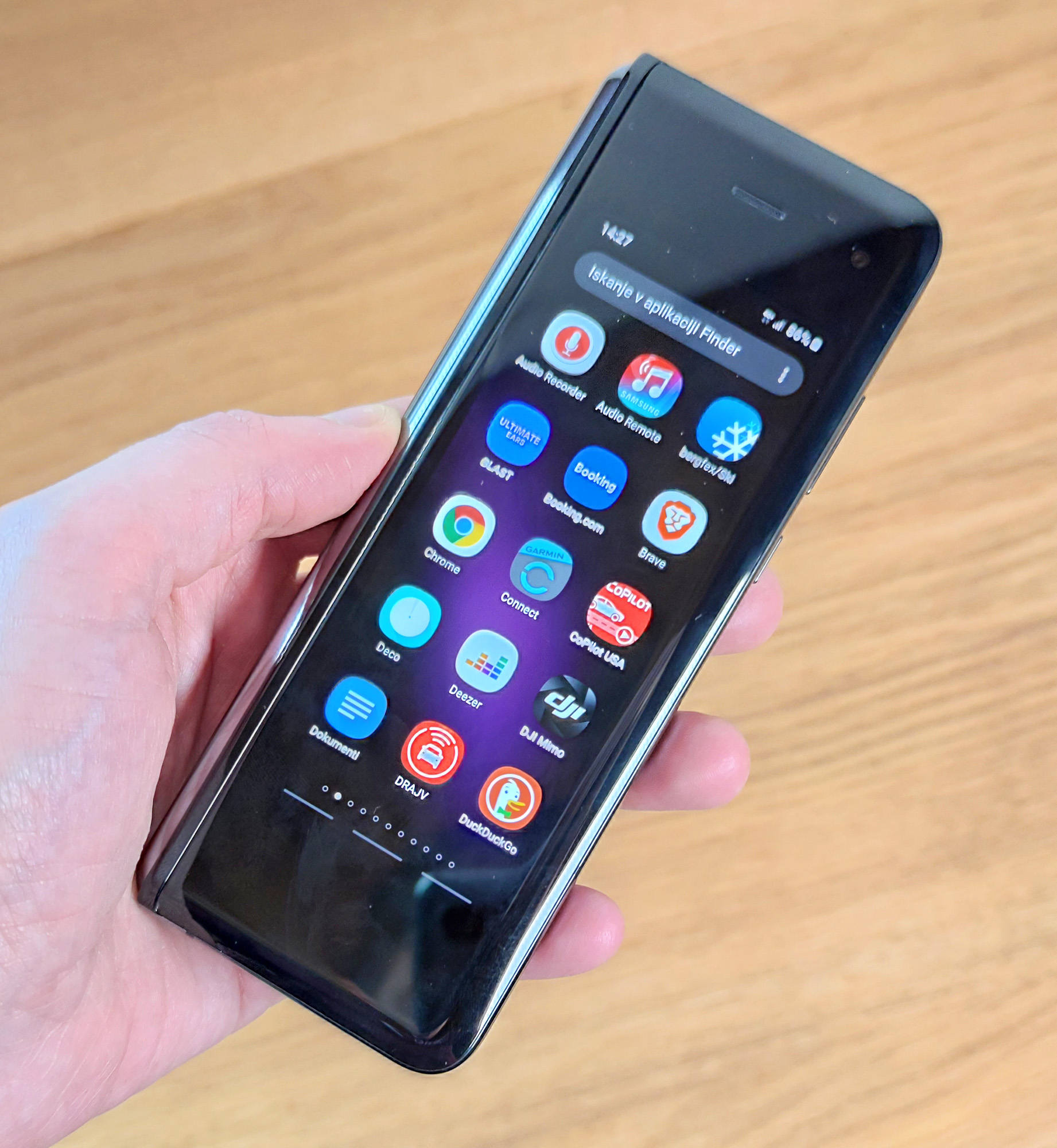Po spomladanski polomiji s trdoživostjo so se potrudili in naredili dokaj uporabno napravo. Seveda je debela in »notranji« preklopni zaslon ni dobro zaščiten, a drugače ne gre. Zamižal bom tudi nad njegovo veliko zaslonsko zarezo s kamerami, nasploh menim, da jih Fold šest nikakor ne potrebuje. Sklopljen je ožji od običajnih telefonov, zato ga je udobneje držati prislonjenega k ušesu. (Pre)ozek sprednji zaslon prav dobro služi običajnim nalogam, ko potrebuješ večjega, »telefon« razklopiš. Všeč mi je tudi, kako se zglob razširi, ko telefon preklopiš, da se zaslon lepo zloži po primerni krivulji in ne preveč koso, kar bi gotovo čez čas povzročilo katastrofalno okvaro. Guba ne moti, vidiš jo, a se jo tudi navadiš, nekoliko neobičajno razmerje »velikega« zaslona pa se je tudi izkazalo kot sila primerno za marsikatera opravila. Še posebej za brskanje po spletnih straneh, ko so te v namiznem načinu. Ene stvari pa vseeno ne razumem, ko pa je vendarle preprosto rešljiva. Zakaj zaslona ni mogoče deliti tudi po vodoravni ravnini, kar ima po mojem tudi veliko primerov rabe.