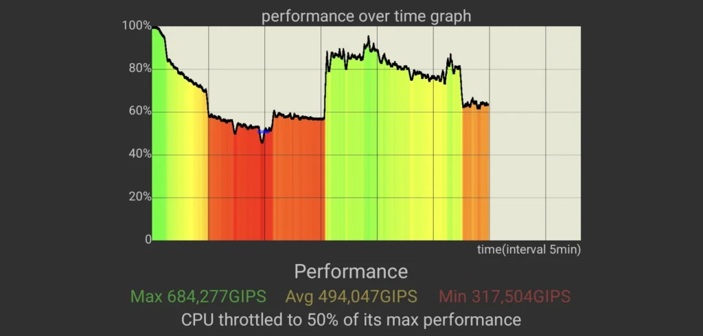 Kaj hitro tako ugotovimo, da je edina resna razlika procesor. O njem sem že povedal svoje, zato poglejmo še segrevanje ob polni obremenitvi. To je kar izrazito, vendar graf ni bistveno drugačen od tistega, ki ga izkaže S26 Ultra. Padec zmogljivosti na začetku je opazen, nato pa se telefon stabilizira in ostane v varnem območju. V praksi nisem opazil težav, ki bi preprečevale zahtevnejše igranje ali uporabo.