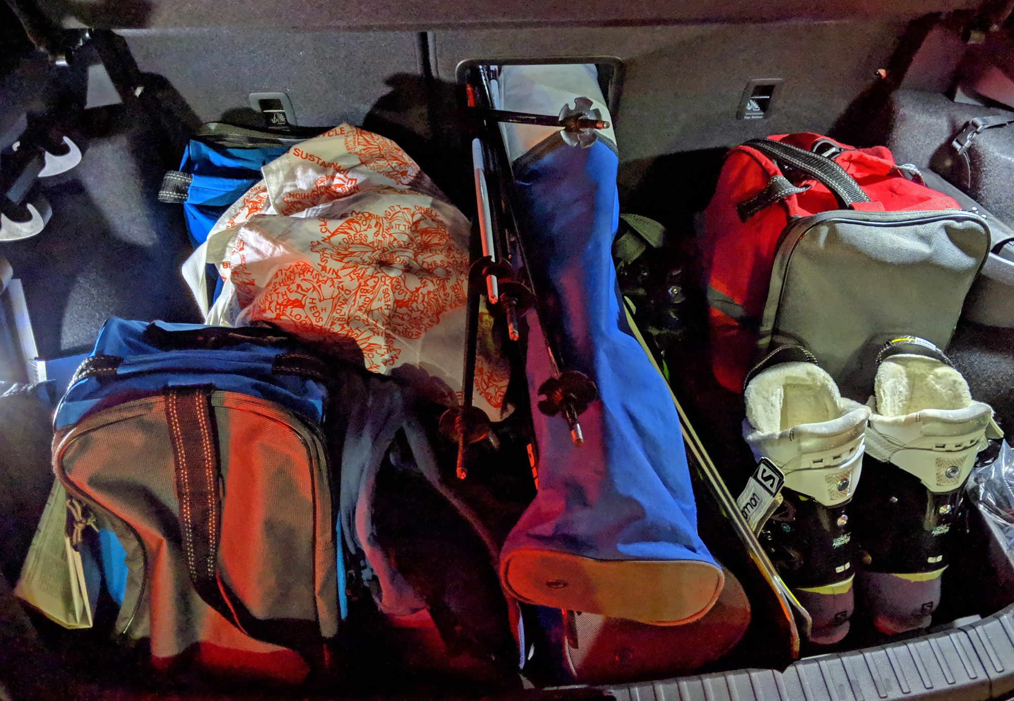 Škoda je pri dimenzijah doslej večinoma igrala malo zunaj pravil. Octavia in Superb sta prostorska prvaka, vendar tudi dimenzijsko malo odstopata od razrednih povprečij. Karoq pa je prej mend manjšimi kot večjimi v svojem razredu. Dolg je 4,38 m in širok nekaj več kot 1,8 m. Volkswagnov Tiguan je je deset in Nissan Qashqai za en cm daljši, francoska konkurenta Peugeot 3008 in Renault Kadjar sta ravno nekje vmes. Ima pa, to upam trditi, Karoq najbolje izkoriščen prostor od vseh. Spredaj se sedi razkošno, na zadnji klopi je tudi za visokim voznikom (prištevam se v to kategorijo) najmanj enako, verjetno pa več prostora kot v običajnem avtu nižjega srednjega razreda, prtljažnih 521 l pa sploh ni zanemarljivih. Primerljiva količina litrov kot v kakšnem precej daljšem karavanu, oblika prtljažnika pa precej drugačna. V Karoqa gre veliko kovčkov in/ali torb in tudi tu je nekaj drobnih uporabnosti, ki jih drugi proizvajalci kar uspejo zanemarjati. Na levi je drog s tremi veliki kljukami za obešanje vrečk. Blizu je lučka, ki jo je mogoče vzeti ven in se takrat spremeni v baterijsko svetilko. V uporabnih dodatnih razdelkih na obeh straneh najdemo zložljivo škatlo in pregradno mrežo, v zadnji klopi, ki se sicer zlaga klasično po sistemu 60:40 (vendar priročno z vzvodoma v prtljažniku), pa je velika sredinska odprtina. Običajno imajo avti precej manjše luknje, ki so le delno uporabne. S Karoqom pa gredo preizkušeno lahko štirje na smučarski izlet. V opremi Sportline je ta odprtina serijska, pri drugih nivojih opreme jo je menda treba dokupiti. Se pa lahko, kdor avto naroča po svojih željah, odloči tudi za tri ločene sedeže v drugi vrsti, čemur se reče Varioflex in stane približno 350 evrov (vendar ne pri Sportlineu). Te sedeže je mogoče ločeno podirati in celo odstraniti iz avta. Če srednjega, ožjega, ni v vozilu, se lahko ostala dva pomakneta bolj proti sredini. So pa sedeži pomični tudi vzdolžno, s čimer lahko prtljažnik naraste na največ 588 l, vendar takrat vprašanje, kdo sploh lahko sedi zadaj. In v osnovi je z Varioflexom prtljažne prostornine manj, saj sedeži zasedejo nekoliko več kot klop, tako da se izgubi približno 40 l (kapaciteta je 479 l namesto 521 l). Osebno se mi rešitev z dovolj veliko odprtino zdi čisto v redu.